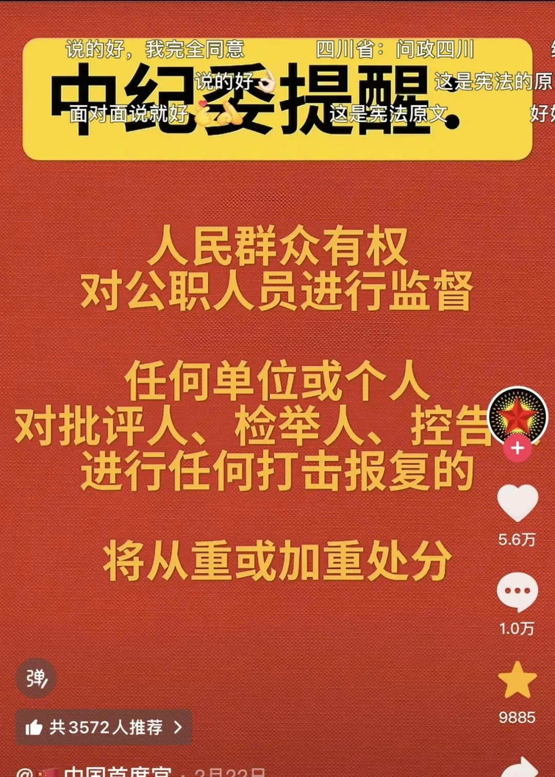 过年期间刷短视频,看到有博主提到,人民群众有权对公职人员进行监督,任何单位或个人对批评人、检举人、控告人进行任何打击报复的,将从重或加重处分,该视频获不少网友点赞。
