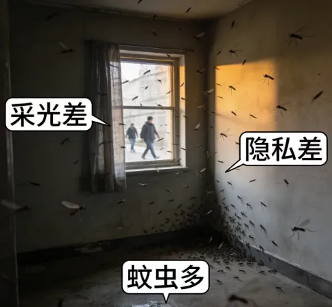 一楼:你以为的花园秘境,实际是居住地狱。谁买一楼谁懂,幻想里的院子是烧烤、凉亭、晒太阳,现实里的一楼全是“硬伤。 通风/采光/视野/隐私,四大问题全占齐。白天不拉窗帘,路人路过能瞟到你家电视、床;拉上窗帘,屋内常年阴沉沉,绿植晒不到,家具易受潮。蚊虫+潮湿,是无解的死穴。离地面近,积水、绿植滋生的蚊虫比楼上多几倍,灭蚊剂、纱窗根本治不住;地下室/负一漏水返潮是常态,墙长毛、地垫发霉,装修再贵都白搭。噪音+邻里矛盾,躲都躲不开。单元门开关的“咣当声”、深夜跺脚咳嗽亮声控灯的声响,格外闹心;院子烧烤、扫落叶,还容易和楼上邻居起冲突。性价比低到离谱。单价不低,装修要额外做防潮、防蚊虫、隔音,成本比普通楼层高;后期转手难,小区里一楼挂牌的永远最多。