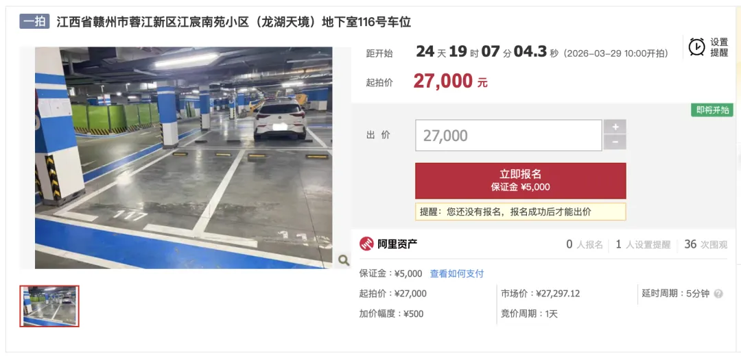 日前,赣州蓉江新区江宸南苑小区,也就是龙湖天境一期一共 6 个地下车位突然上架拍卖。这些车位都办了不动产权证,所有权人为赣州锦誉置业有限公司,也就是项目的开发商。
