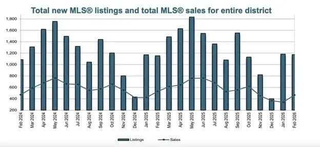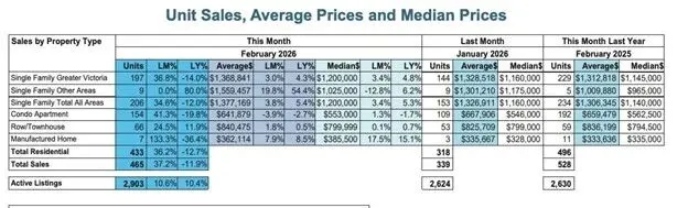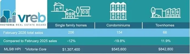 2026年2月,Victoria Real Estate Board辖区共售出 465套房产,相比2025年2月的528套下降 11.9%,但与2026年1月相比则大幅增加 37.2%,显示市场交易活动正在逐步恢复。