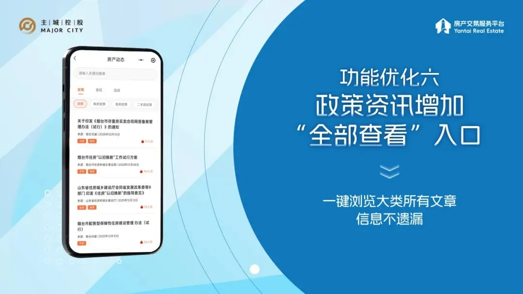 新春伊始,万物向新。烟台主城房产交易服务平台上线试运行以来,运行平稳顺利,收获了广大市民和行业伙伴的关注与认可。以此次试运行为重要契机,平台快马加鞭,集中优化系统响应速度,加快历史房源数据补充,同步收集房地产开发企业、经纪机构及用户使用反馈,稳步推进功能迭代升级。目前,围绕信息获取效率、找房精准度、浏览流畅性等体验细节,平台已完成首轮优化升级。