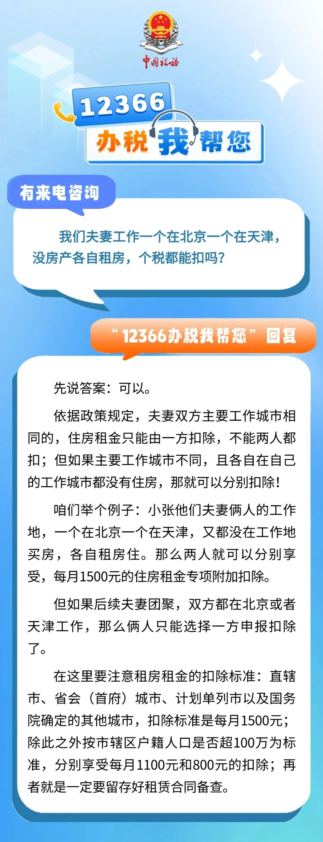 有来电咨询 :我们夫妻工作一个在北京一个在天津,没房产各自租房,个税都能扣吗?一起来看看回复吧↓