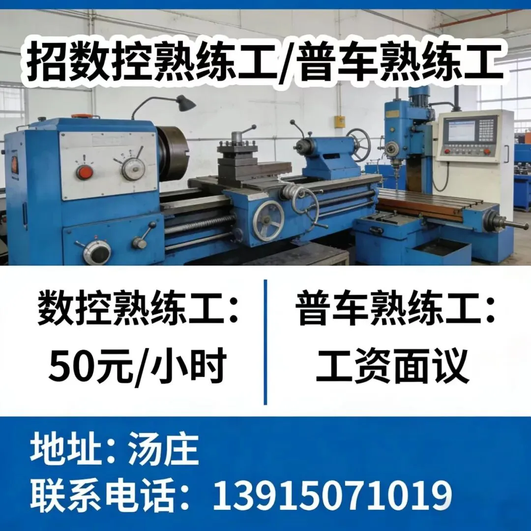 【招聘】招数控熟练工,50/小时,普车熟练工,工资面议。