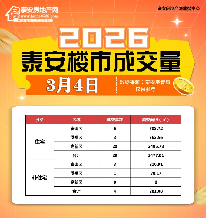 【泰安房地产网讯】据本站不完全统计,2026年3月4日泰安市共成交商品房33套,其中住宅网签29套,总面积3477.01㎡,办公、商业网签4套,总面积281.08㎡,与3月3日相比环比上涨312.5%。