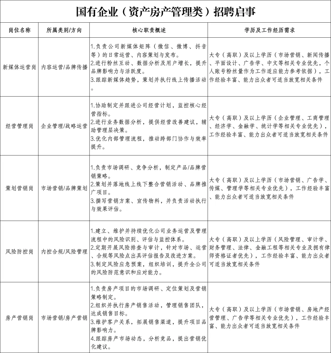 大专(高职)及以上学历(市场营销、房地产经营管理、广告学等相关专业优先),工作经验丰富、能力出众者可适当放宽相关条件。