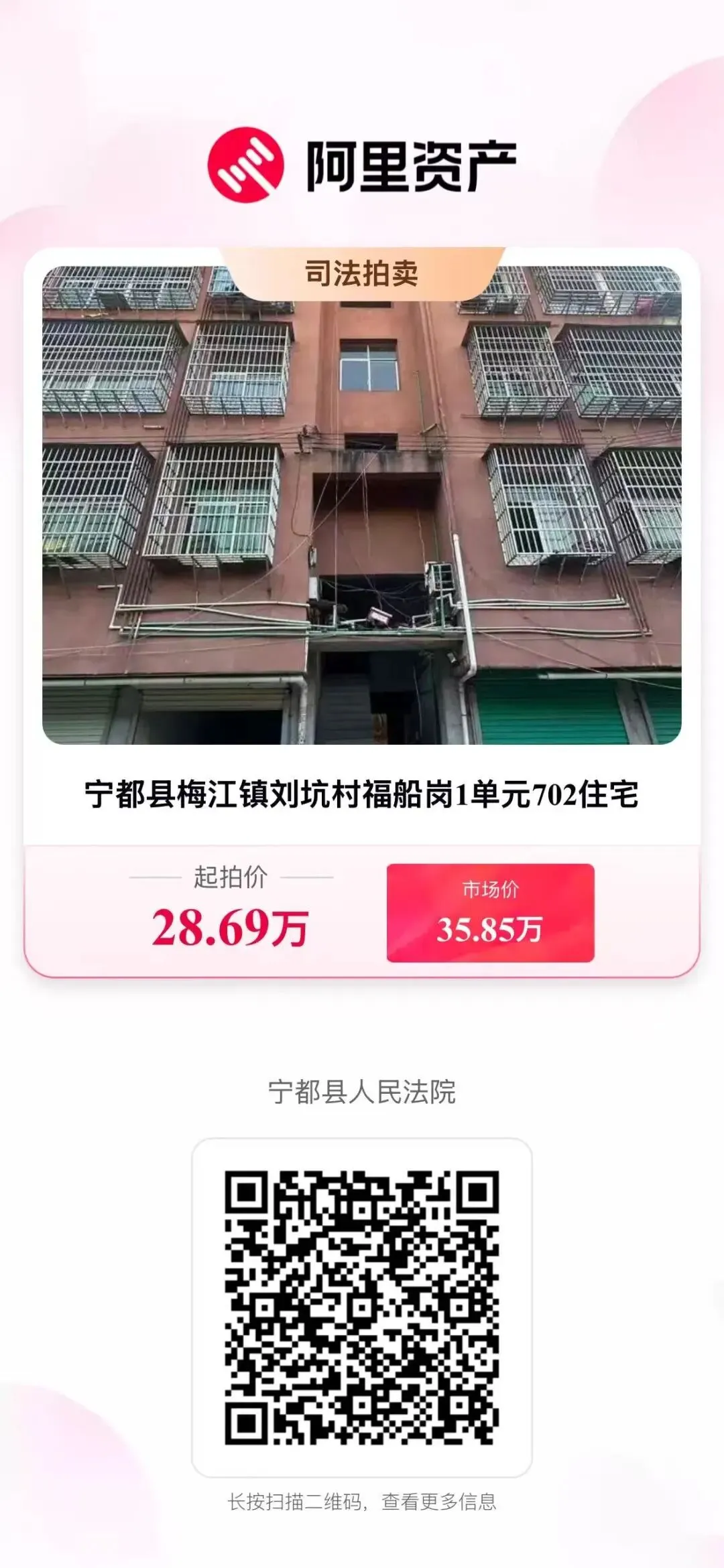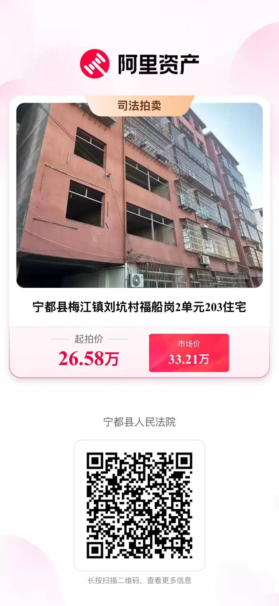 一、变卖标的:宁都县梅江镇刘坑村福船岗2单元203住宅。房产证号:赣(2016)宁都县不动产权第0001098号,建筑面积:122.44㎡,总层数为七层拍卖第二层住宅,混合结构,权利性质:出让/自建房,建筑年份:2016年,使用期限:2011年02月17日起2081年02月16日止。