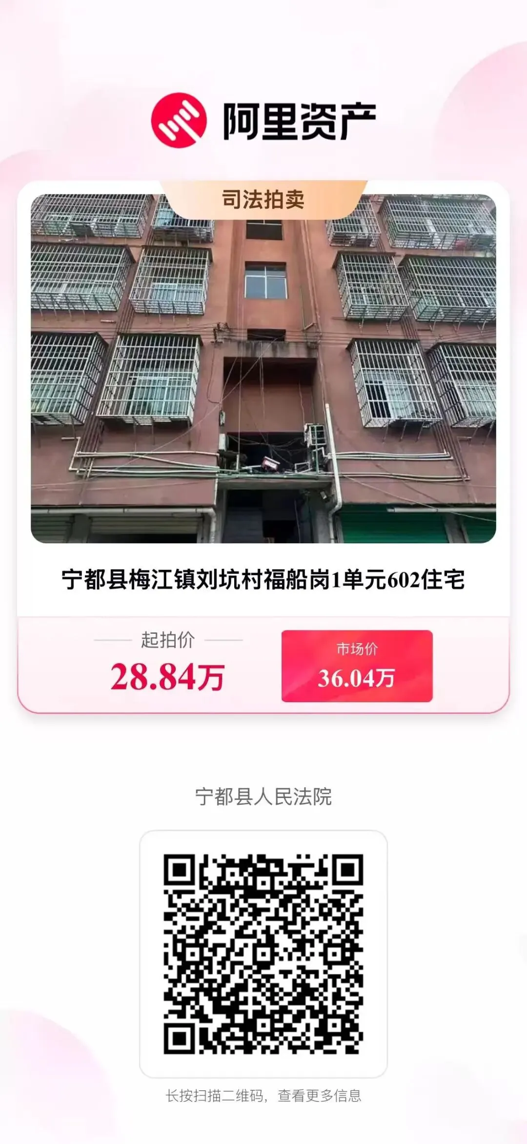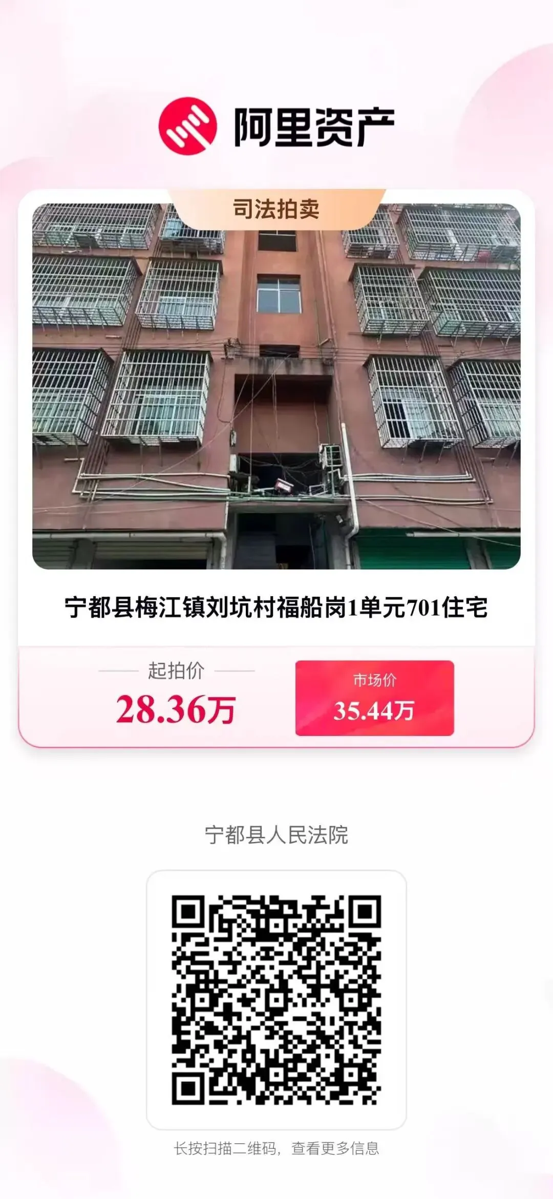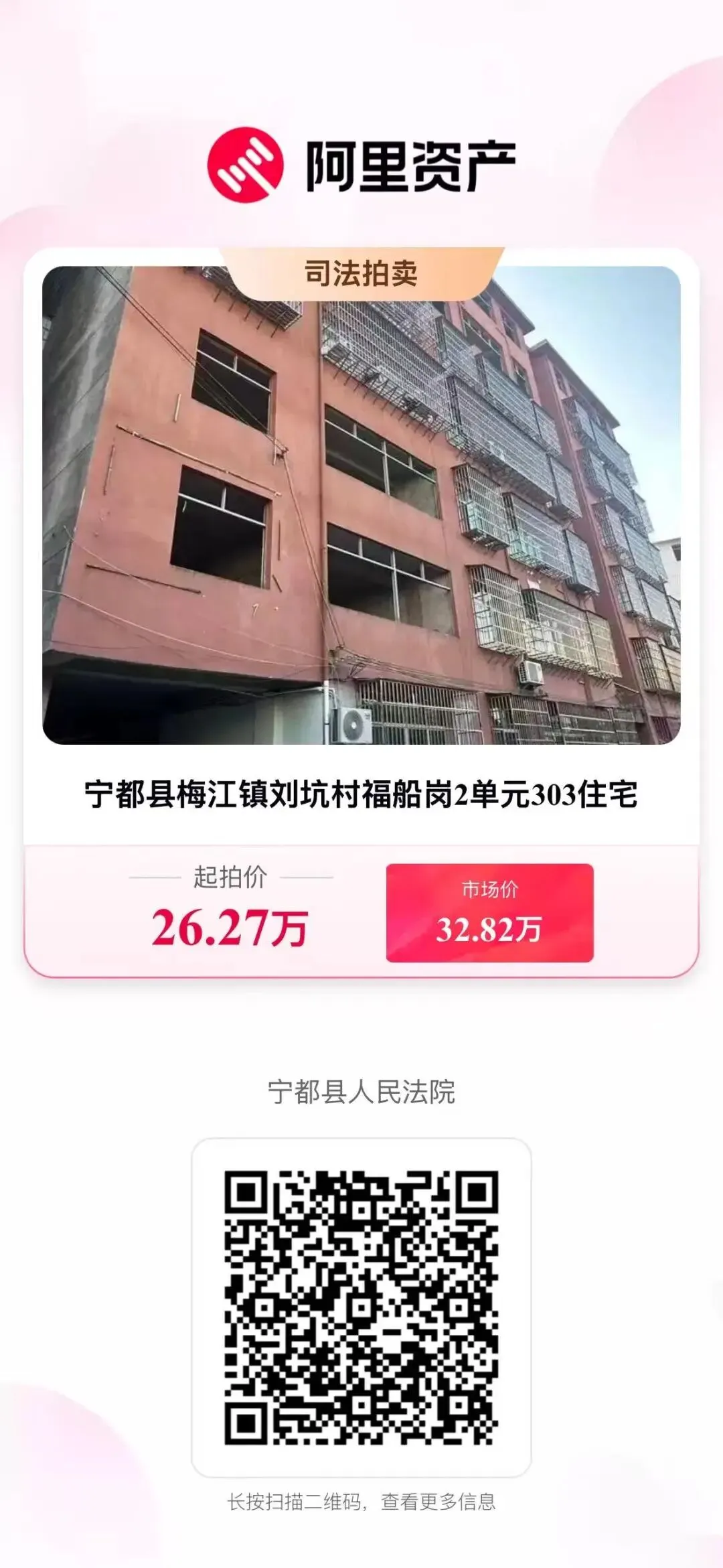 二、变卖标的:宁都县梅江镇刘坑村福船岗2单元303住宅。房产证号:赣(2016)宁都县不动产权第0001099号,建筑面积:122.44㎡,总层数为七层拍卖第三层住宅,混合结构,权利性质:出让/自建房,建筑年份:2016年,使用期限:2011年02月17日起2081年02月16日止。