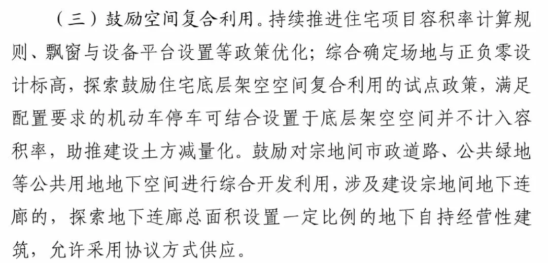 这是文件里最炸裂的一句:“探索鼓励住宅底层架空空间复合利用的试点政策,满足配置要求的机动车停车可结合设置于底层架空空间并不计入容积率,助推建设土方减量化。”- 以前很多小区底层要么是底商、要么是设备房,要么架空但停车还得算容积率或受限。