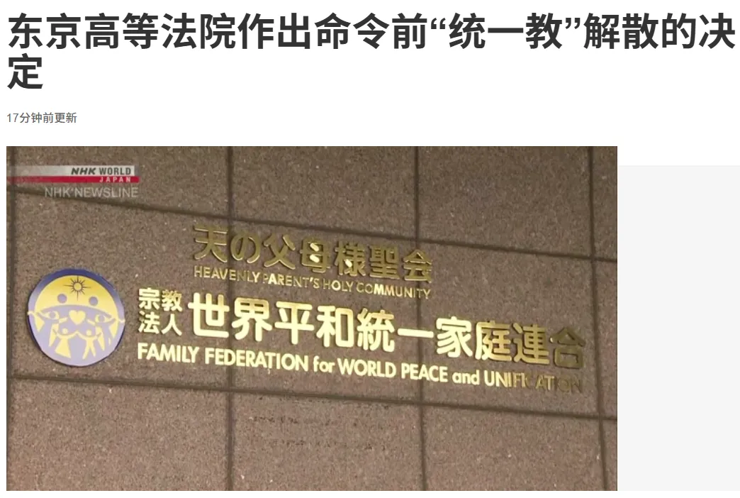 关于日本文部科学省向法院申请对前身为“统一教”的宗教法人“世界和平统一家庭联合”下达解散命令一事,东京高等法院继东京地方法院之后,同样作出了命令该教团解散的决定。