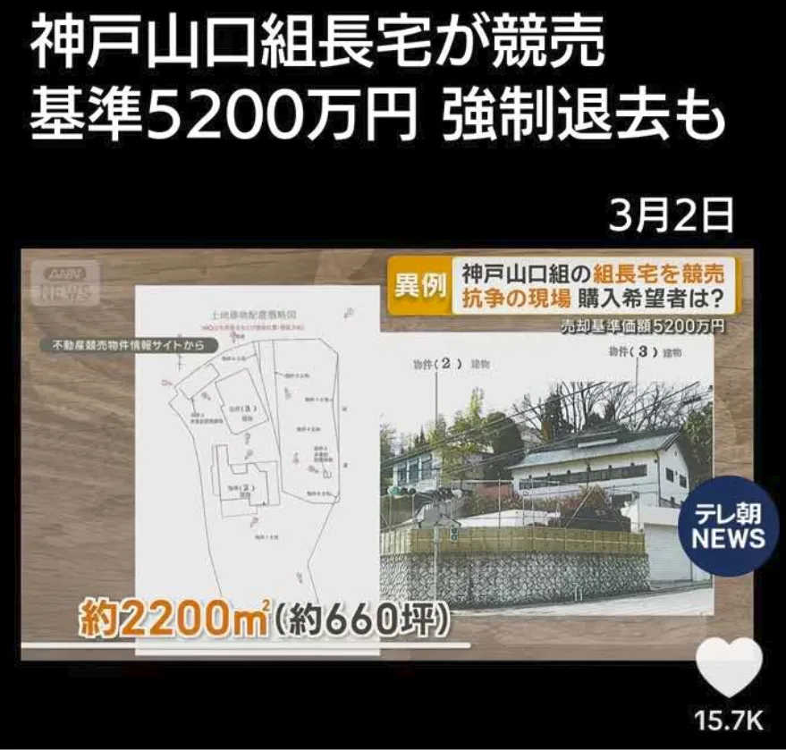 因原下属成员纠纷而承担约2亿7000万日元赔偿责任,且土地与建筑物已被查封的特定抗争指定暴力团组织神户山口组组长井上邦雄的住宅(位于神户市北区),近日将进行强制拍卖竞标。神户地方法院于2月24日发布了拍卖公告,开标日期定于3月24日。根据最终竞标结果,该组长可能面临强制搬离的局面。