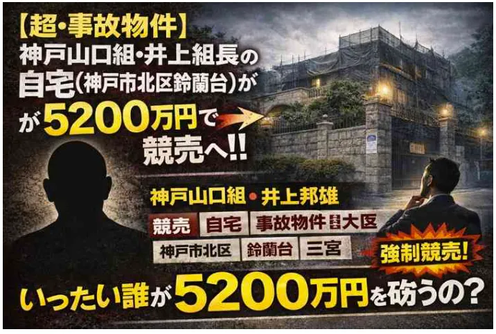 建物の主は、特定抗争指定暴力団「神戸山口組」のトップ、井上邦雄組長。神戸地裁が2月24日、この土地と建物の強制競売の入札を公告したのだ。売却基準価格は5199万円で、3月24日に開札される。
