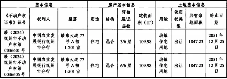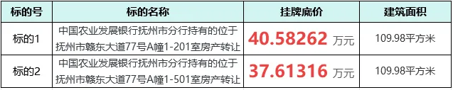 资产包概述:标的为中国农业发展银行抚州市分行持有的抚州市赣东大道77号A幢1-201室、1-501室住宅房产分别转让。