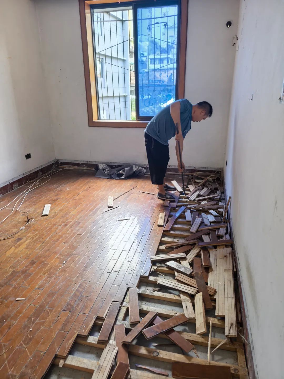 前任业主铺的是老式实木地板,下面还有一层木龙骨。实木地板本身倒不难拆,用撬棍一撬就能取下来,麻烦的是地板钉密密麻麻的,拆完后地上全是钉子头。