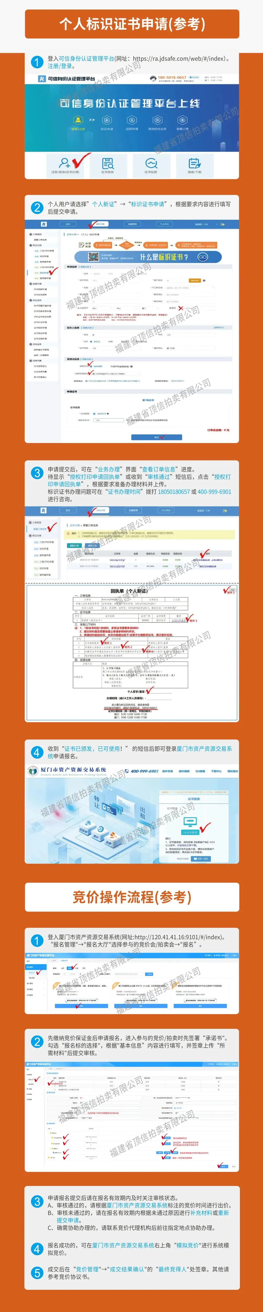 (二)竞价人申请报名前3个工作日内须完成企业CA数字证书(介质证书)或个人标识证书(软证书)的办理。使用已持有省统一CA数字证书、福建政府采购专用CA数字证书的竞价人,首次登录须在福建省公共资源交易电子公共服务平台下的“公共资源交易CA互认(投标单位省统一登录)”进行注册,账户注册后,可通过“厦门市资产资源交易系统”登录页面-“省统一登录”进行登录操作,无需另行办理CA数字证书。自然人可通过可信身份认证管理平台(http://ra.jdsafe.com/web/#/index)免费办理个人标识证书,具体操作步骤详见厦门市公共资源交易网(https://zyjy.as.xm.gov.cn/)首页-通知动态-重要通知-“厦门市公共资源交易中心关于厦门市资产资源交易系统上线试运行的通知”附件《个人标识证书申请操作手册》。
