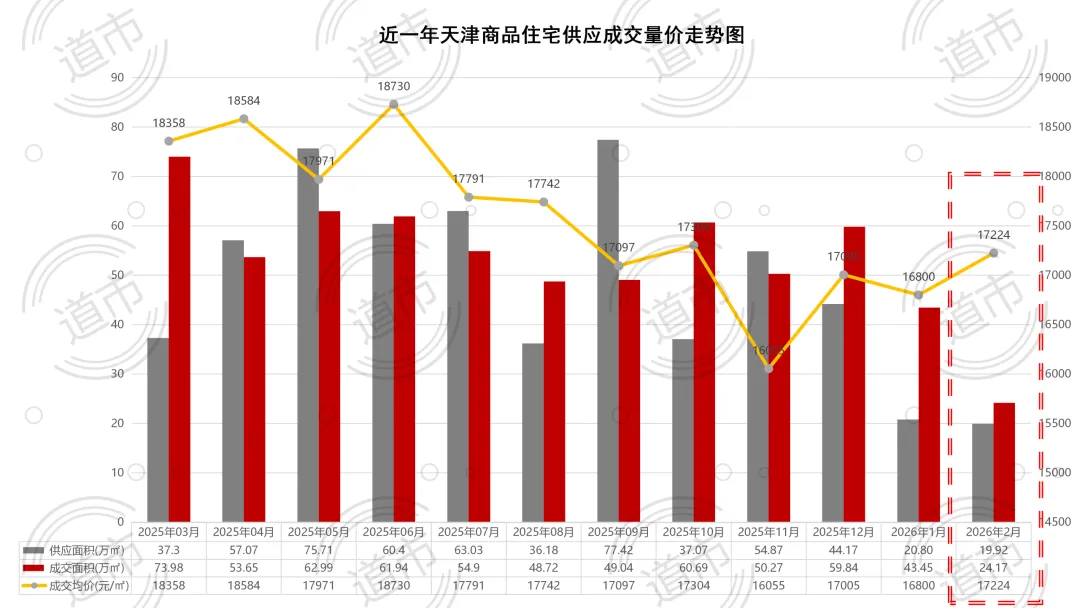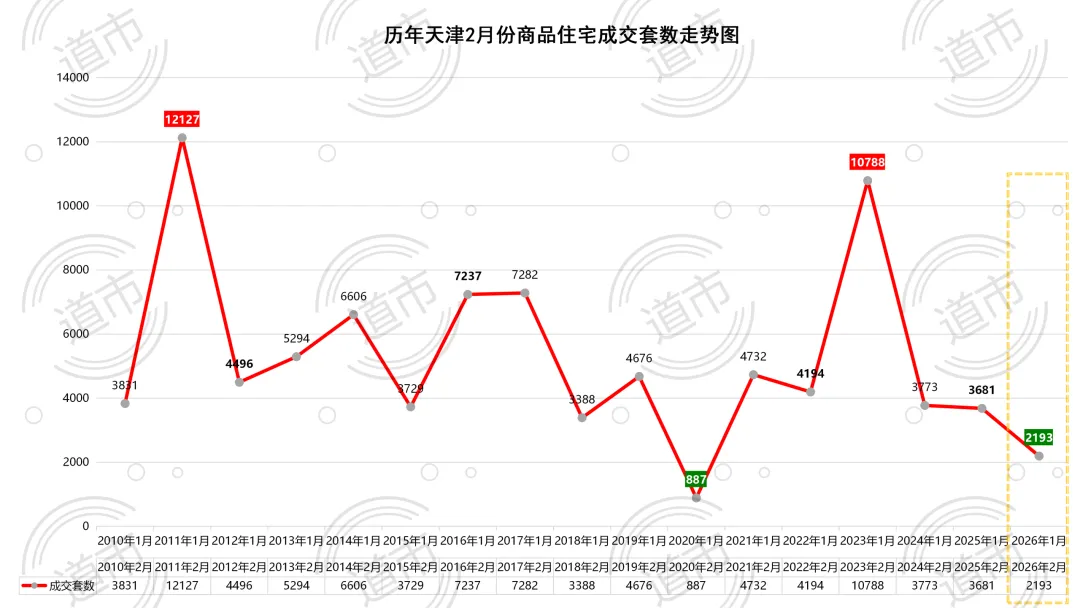 2026年2月楼市天津最新数据出炉,新房下,二手房上。全国视角,2026年2月,重点城市房地产市场呈现典型假日特征。重点50城市新建商品住宅成交面积约675万方,环比下降26%,同比减少28%。成交量虽在低位徘徊,但价格端传递出不一样的信号。根据国家统计局、中指研究院及克而瑞等机构联合发布的数据,2026年2月全国百城新房均价为17114元/㎡,环比微涨0.18%、同比上涨2.52%——这是历经多轮震荡后,新房价格正式实现的止跌回升。二手房均价为12905元/㎡,环比跌幅收窄至0.85%,跌幅连续3个月收窄,筑底信号愈发明确。结论很清晰::全国不再深跌,政策托底见效,市场底部提前到来。聚焦天津,2月天津新房楼市呈现:供应收缩、成交平淡,但价格端保持相对韧性。新增商品住宅供应约19.92万方,同比上涨94.16%,环比下滑4.21%,供应量同比增长幅度较大,核心部分新盘项目入市或加推。成交约24.17万方,同环比分别下滑39.21%、44.38%。道士君同时梳理了历年2月天津新建商品住宅成交套数走势图发现,2026年2月与2020年2月并列为两个历史低点——2020年是“口罩”事件影响,2026年则是市场购买力尚未完全修复的体现。新房价格方面,2月新房备案成交均价为17224元/㎡,同比微降3.2%,环比结构性上浮2.52%。