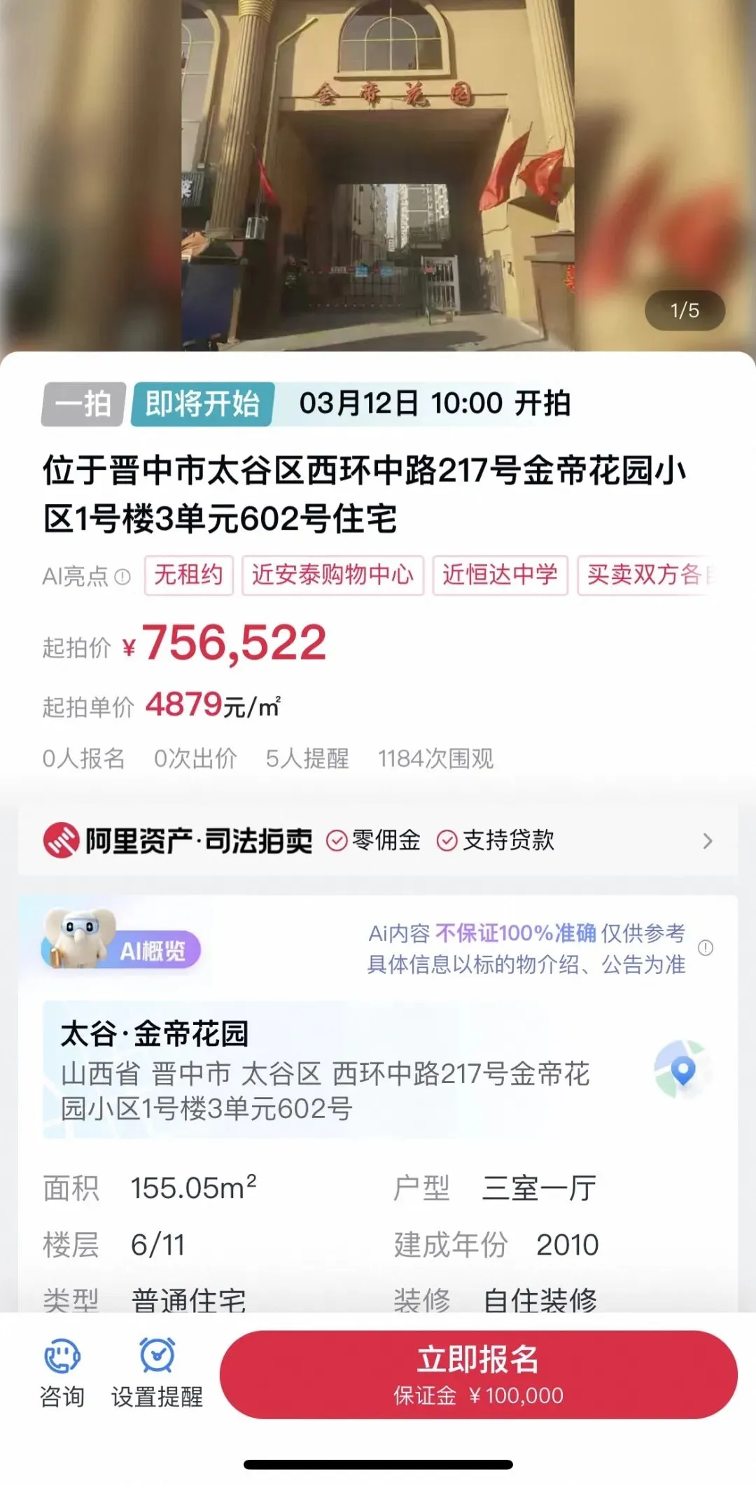 标的名称:位于晋中市太谷区西环中路217号金帝花园小区1号楼3单元602号住宅