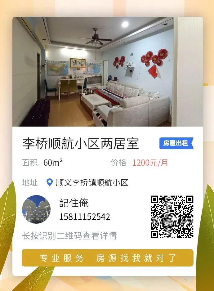 2室1厅1卫1500元/月,北京市顺义区李桥镇南庄头村 位于通州区与顺义区交界处李桥镇南庄头村临街封顶小前院首租,房子大概90平,院子约20平左右,干净整洁,厨房、卫生间,空调、家电、地暖(电)、网络等家具可自带可简配。民水民电。周边停车位充足,院内可烧烤,村口公交车站,村内健身娱乐设施齐全,有小公园,环境优美,周边交通便捷,临近潮白河森林公园及通州、燕郊、通州安贞、友谊医院20分钟左右。