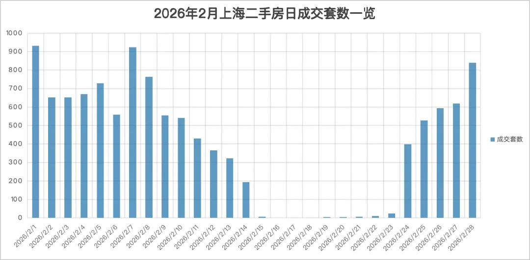 受春节假期影响,2月上海楼市走出分化行情:二手房市场在节后迅速修复,月底更是在新政催化下呈现“翘尾”行情,走出“V”形反弹。节前市场保持平稳运行:2月1日以931套成为当月成交高点,2月7日再度录得924套的次高点。2月15日春节假期首日,成交量断崖式下滑至7套;自2月16日起,市场连续4日零成交,2月20日、21日个位数成交,但直至2月23日假期最后一天也仅成交24套。