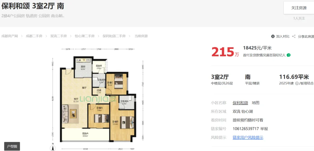 2026年03月04日,据市场端消息:成都双流怡心湖,保利怡心和颂建面117平套三报价215万;目前房东心里价在215万愿意出售。