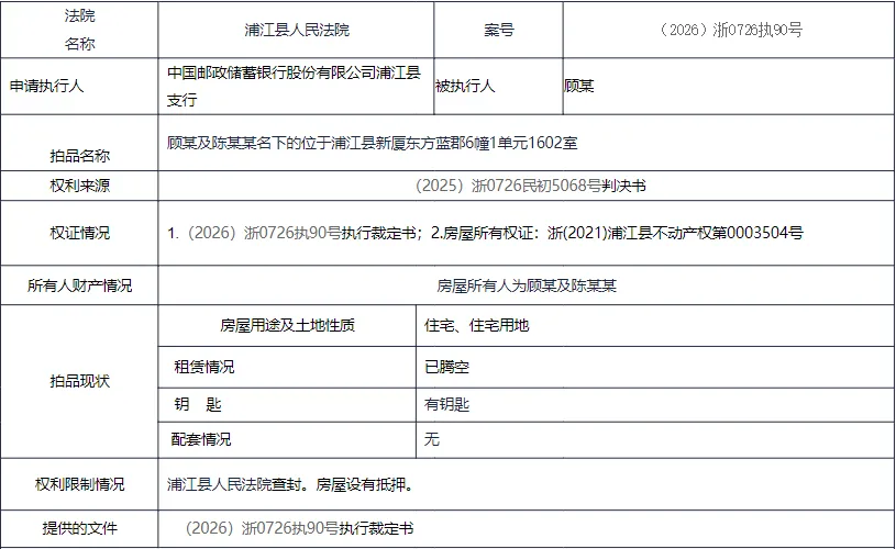 浦江县新厦东方蓝郡6幢1单元1602室住宅房地产一拍拍卖时间: