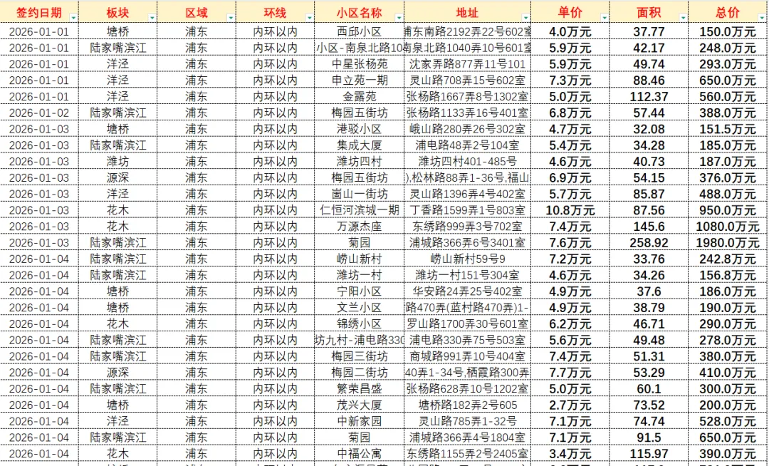 >2026年1-2月浦东内环内二手房成交数据