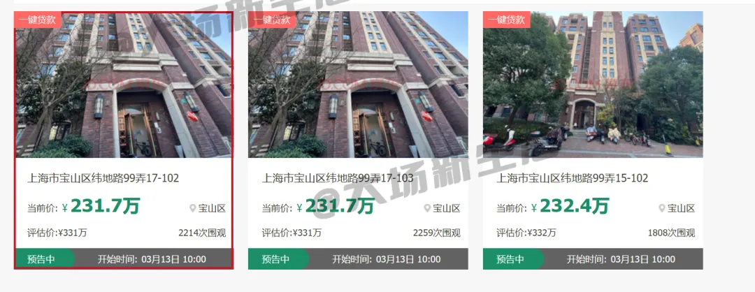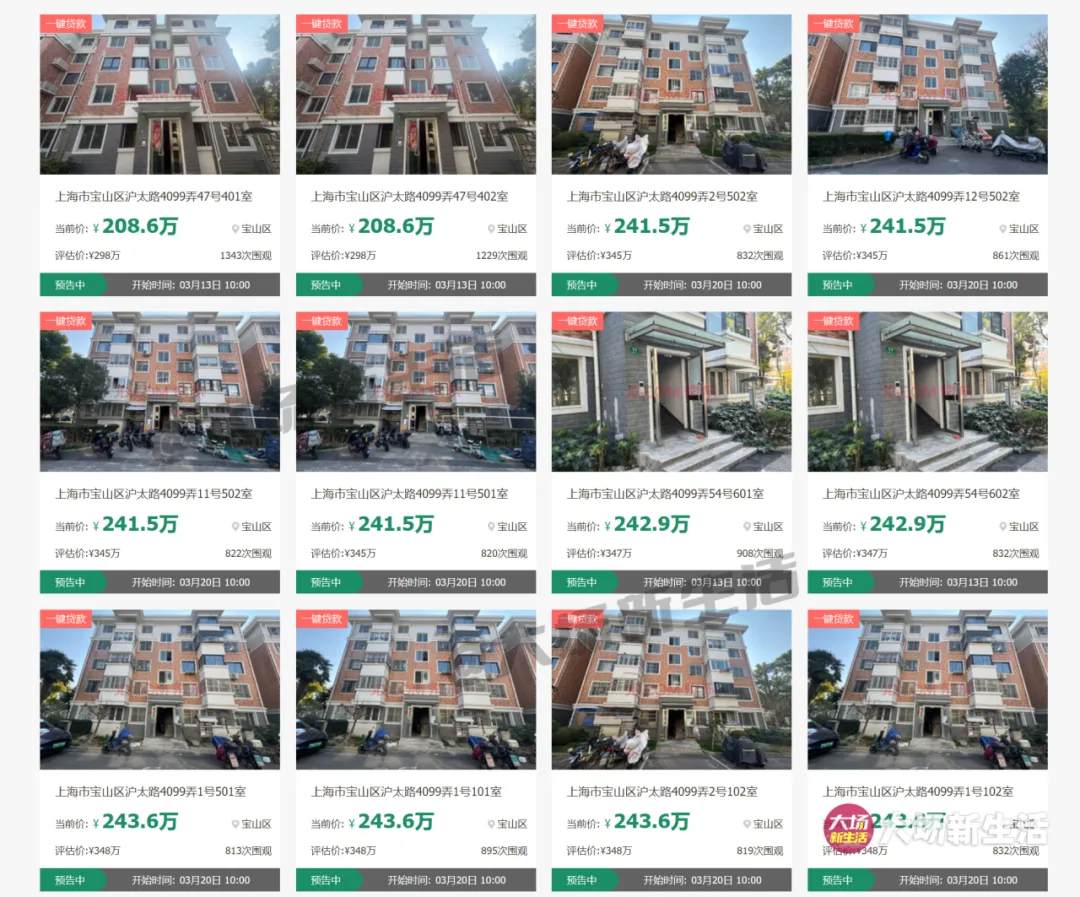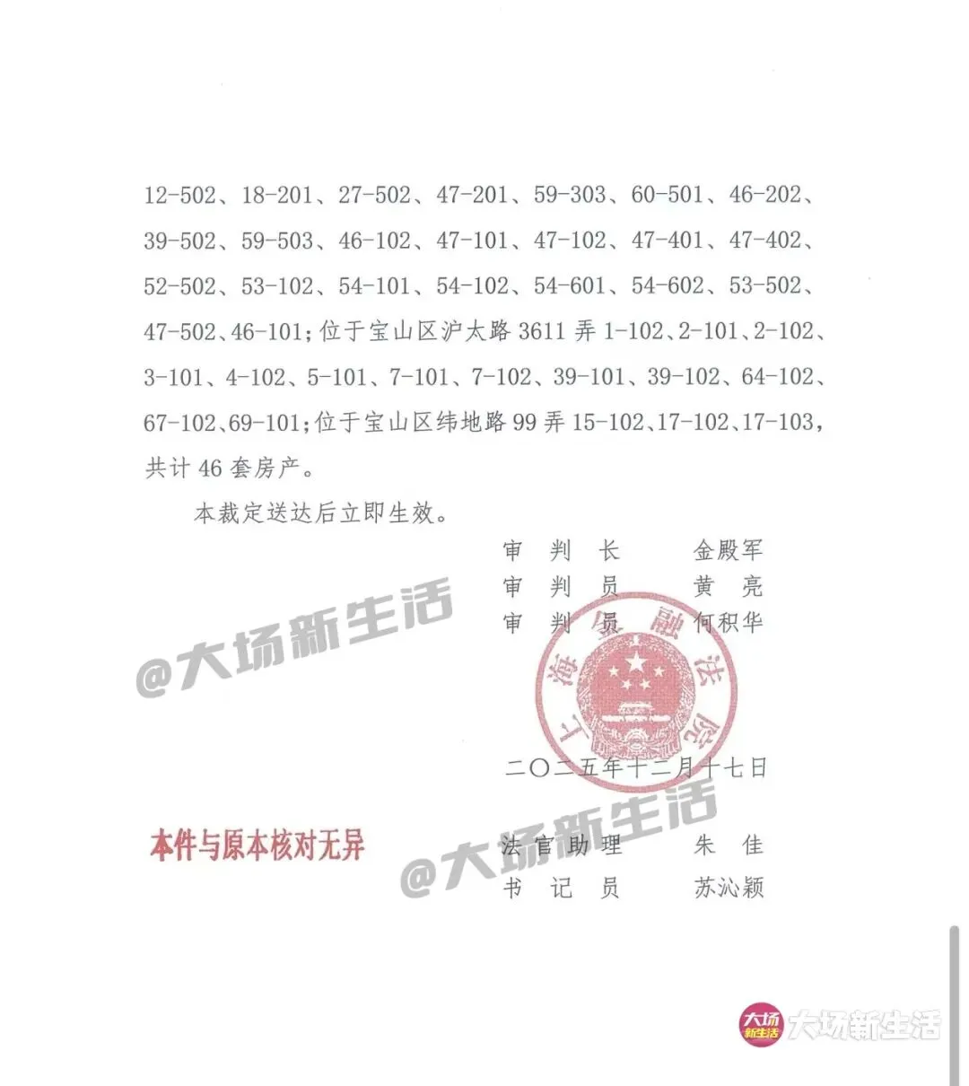 据上海金融法院执行裁定书,经纬和泰苑(沪太路4099弄)30套、祥泰苑(沪太路3611弄)13套、学士逸居(纬地路99弄)3套,共计46套房产将变价拍卖,以清偿被执行人拖欠的债务。