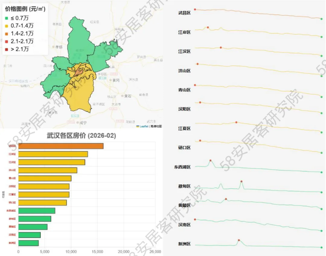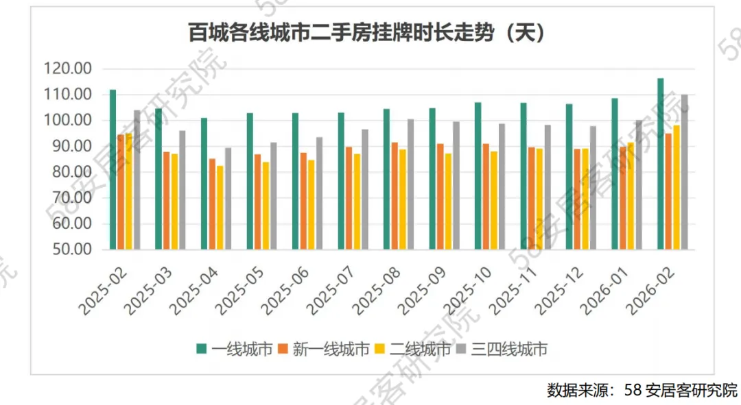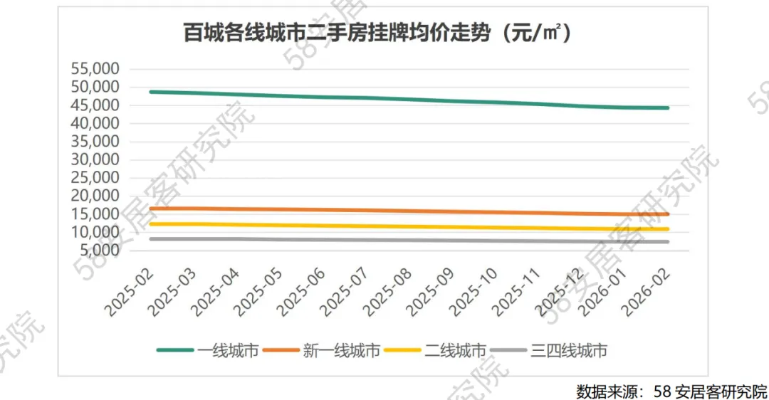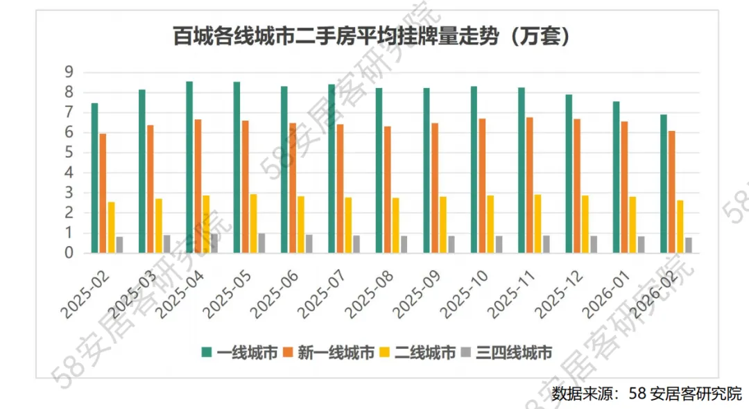 2026 年 2 月百城二手房市场延续 "筑底蓄力、分化加剧" 的调整态势,核心特征表现为 "量能边际改善、价格震荡寻底、城市冷热不均",市场正从快速下跌转向弱平衡状态下的结构重塑。供需层面,挂牌量延续去化态势但同比近乎持平,一线城市环比降幅领跑而二线城市库存压力持续累积,呈现出"高能级边际改善、低能级困局未解" 的鲜明反差;与此同时,找房热度高位回落、动能减弱,一线城市全面承压而部分二线城市逆势增长,反映出前期政策刺激效应进入消化期,购房者观望情绪升温,供需错配的结构性矛盾依然突出。流动性与价格指标同步印证市场分化深度:挂牌时长普遍拉长,长三角核心城市 "冰火两重天"、北方二线城市去化周期显著承压,人口与产业禀赋成为决定流动性的核心变量;挂牌均价环比微降但同比降幅收窄,一线城市内部分化显著,强省会城市展现韧性而前期热点城市深度调整,市场正经历由高基数城市向外围扩散后的估值再平衡。