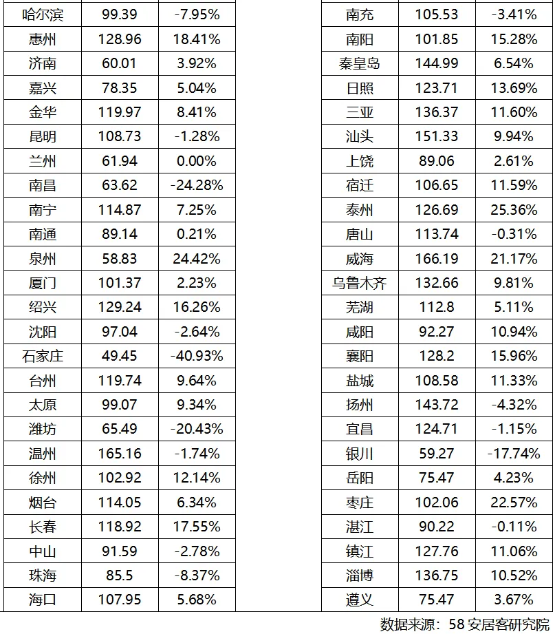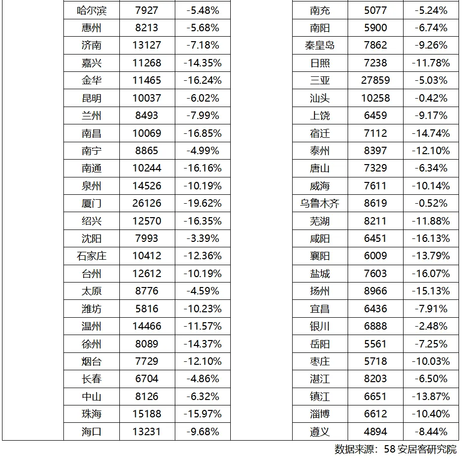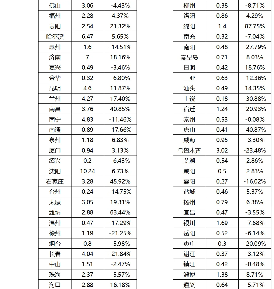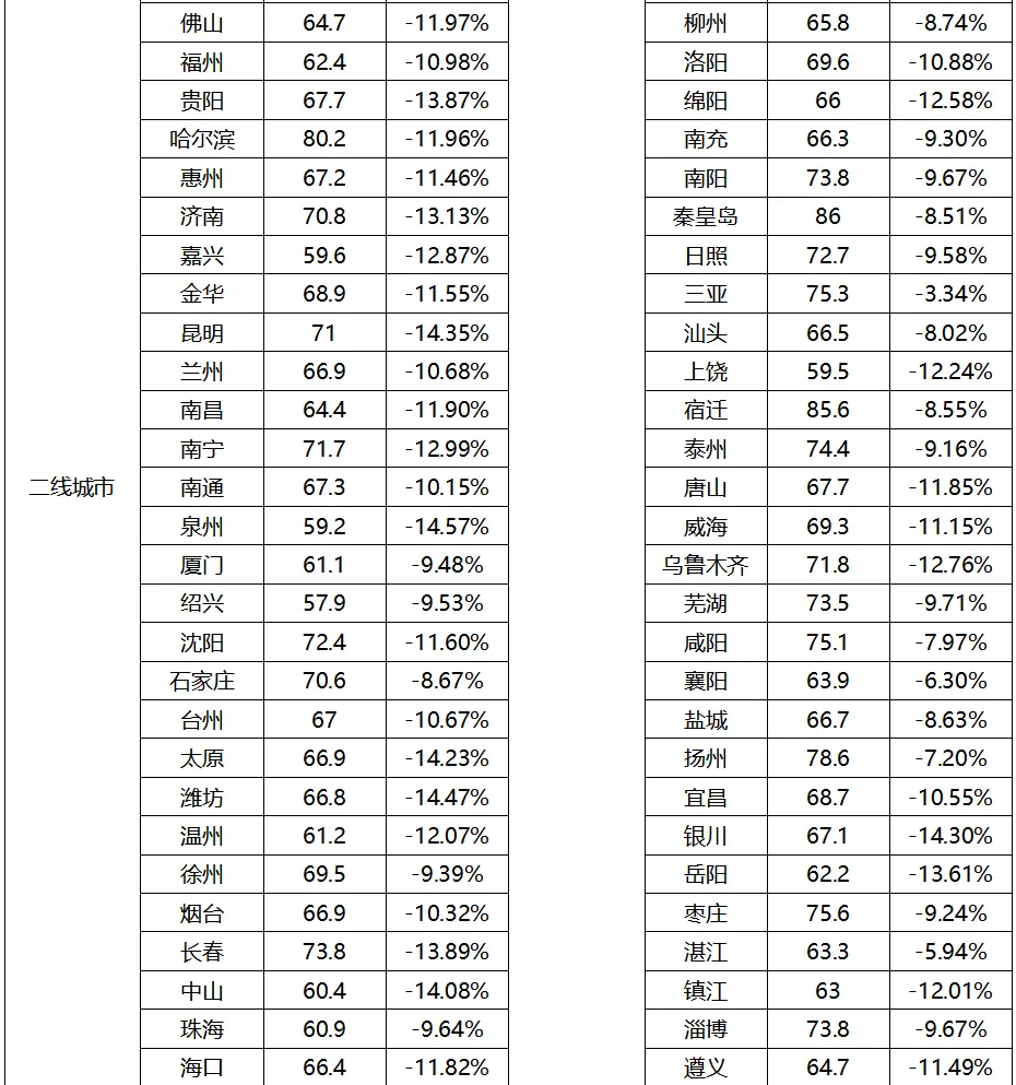 从同比变化的城市分化来看,一线城市下降TOP(按同比降幅从大到小):深圳(-13.35%)、北京(-12.83%)、广州(-12.01%)、上海(-10.67%)。新一线城市下降 TOP(按同比降幅从大到小):杭州(-17.91%)、青岛(-14.61%)、东莞(-14.50%)、长沙(-14.34%)、宁波(-14.23%)、天津(-14.18%)、成都(-14.07%)、苏州(-13.48%)、重庆(-12.95%)、南京(-12.32%)、佛山(-11.97%)、西安(-11.94%)、沈阳(-11.60%)、郑州(-10.07%)、武汉(-9.90%)。二线城市下降 TOP(按同比降幅从大到小):常州 - 17.43%、绍兴(-9.53%)、厦门(-9.48%)、徐州(-9.39%)、石家庄(-8.67%)、汕头(-8.02%)、扬州(-7.20%)。