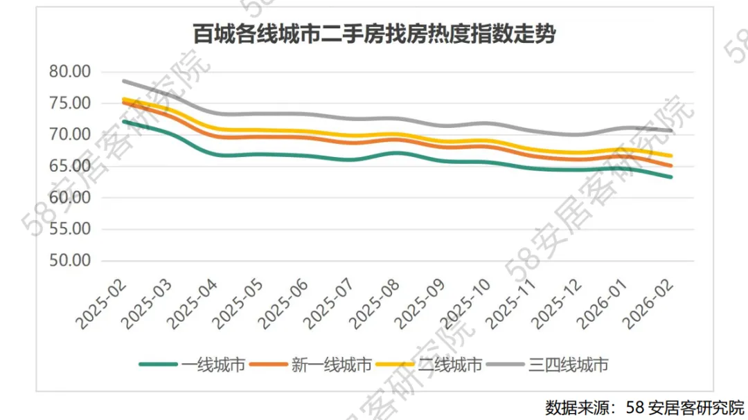 2026 年 2 月,百城二手房找房热度为 68.36,环比下降 1.08%,同比微降 0.11%。从各能级城市表现来看,一线城市找房热度环比全部下行,平均降幅达 2.05%,其中北京环比下降 3.83% 领跌,广州逆势微增 0.16% 成为唯一正增长城市;新一线城市环比平均下降 2.19%,杭州、宁波、东莞降幅超过 2.30%,武汉、郑州分别微增 0.46% 和下降 2.65%;二线城市环比分化明显,汕头、徐州分别增长 2.62% 和 1.61%,厦门、绍兴、扬州降幅在 0.33%-1.53% 之间。同比维度上,各能级城市均呈现负增长态势,一线城市平均同比下降 12.24%,新一线城市平均同比下降 13.36%,二线城市平均同比下降 11.89%,二线城市降幅相对温和。