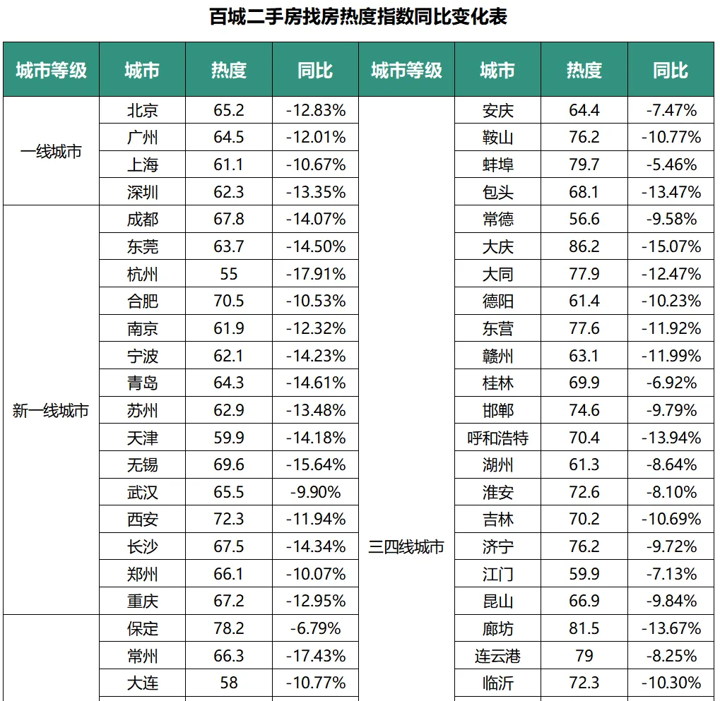 城市分化呈现显著特征:一线城市中深圳、北京降幅最深,上海相对韧性较强;新一线城市内部梯度明显,杭州以- 17.91% 领跌,武汉、郑州降幅控制在 10% 以内;二线城市整体抗压性优于高能级城市,扬州、汕头、石家庄等城降幅均在 9% 以内,反映出低能级城市找房需求基数效应与政策托底的双重影响。