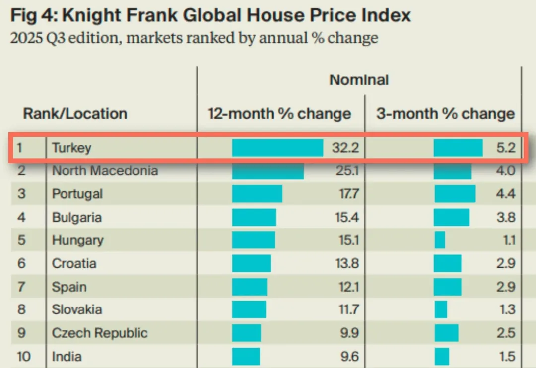 2025年Q3全球房价指数显示:土耳其房价年涨幅约32%,伊斯坦布尔核心区租金回报率约6%-8%。