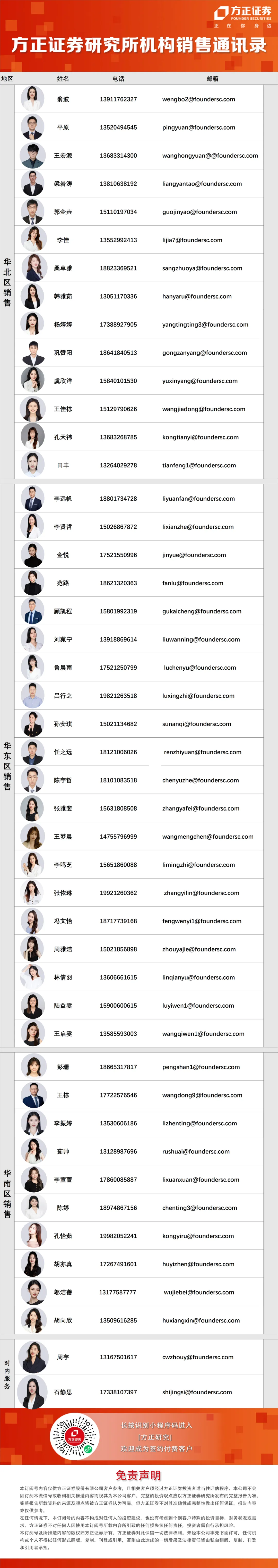 本研究报告由方正证券制作及在中国(香港和澳门特别行政区、台湾省除外)发布。根据《证券期货投资者适当性管理办法》,本报告内容仅供我公司适当性评级为 C3 及以上等级的投资者使用,本公司不会因接收人收到本报告而视其为本公司的当然客户。若您并非前述等级的投资者,为保证服务质量、控制风险,请勿订阅本报告中的信息,本资料难以设置访问权限,若给您造成不便,敬请谅解。 在任何情况下,本报告的内容不构成对任何人的投资建议,也没有考虑到个别客户特殊的投资目标、财务状况或需求,方正证券不对任何人因使用本报告所载任何内容所引致的任何损失负任何责任,投资者需自行承担风险。 本报告版权仅为方正证券所有,本公司对本报告保留一切法律权利。未经本公司事先书面授权,任何机构或个人不得以任何形式复制、转发或公开传播本报告的全部或部分内容,不得将报告内容作为诉讼、仲裁、传媒所引用之证明或依据,不得用于营利或用于未经允许的其它用途。如需引用、刊发或转载本报告,需注明出处且不得进行任何有悖原意的引用、删节和修改。