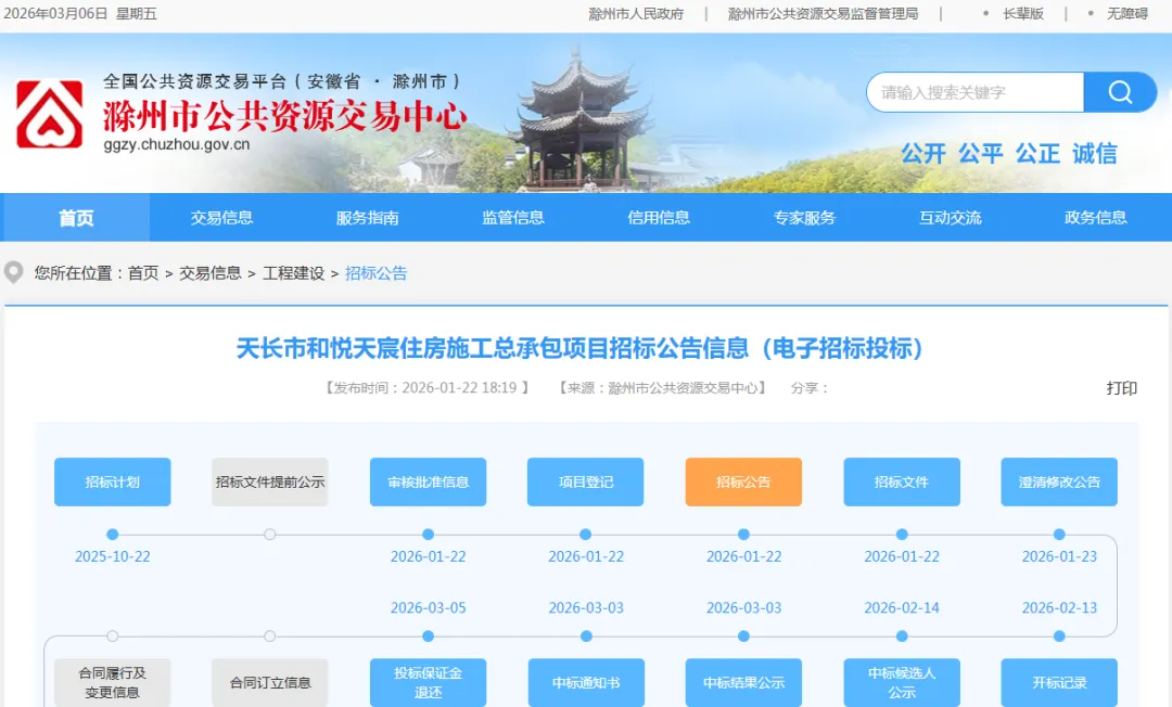 2026年3月5日消息,天长市总投资约12.8亿元的和悦天宸住房施工总承包项目招标落幕,由本土标杆企业安徽中南天开建设集团牵头、央企中铁十九局协同的联合体中标,中标金额约10.77亿元,该项目是天长市2026年重点民生工程,也为当地 “十五五” 发展目标注入民生动能。