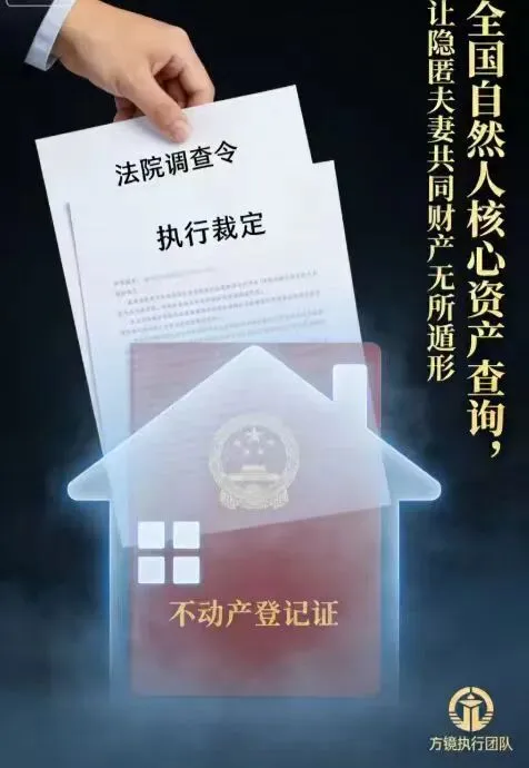 打赢官司却拿不到钱,明明知道债务人有财产,却因房产只登记在其配偶名下,成了执行路上的 “拦路虎”;好不容易拿到法院对配偶方的调查令,又因不知房产具体坐落,在不动产中心屡屡碰壁,只能看着本该执行的财产 “触不可及”。 相信这是很多申请执行人在执行阶段都会遇到的糟心事,债务人借着 “房产登记在配偶名下” 的幌子,玩起财产转移的把戏,妄图通过这种 “金蝉脱壳” 的伎俩逃避执行,让生效判决沦为一纸空文。 但执行之路,从不是孤军奋战!方镜执行团队深耕执行领域,精准直击申请执行人的核心痛点,推出专属产品之【全国自然人核心资产查询】来解决,手握法院调查令 + 执行裁定,合法合规为你穿透财产迷雾,查询被执行人配偶名下的全国房产信息,让隐匿的夫妻共同财产无所遁形,顺利纳入执行范围!