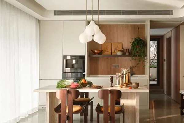 稍稍走了几步,来到了餐厅区域。餐厅的面积适中,而设计师Kale在此的设计也彰显了独运匠心了。一张肌理细致的白色大理石餐桌,四张造型独特的柚木餐椅,就这样围合出了一处端庄大方的用餐空间了。值得提及的是,这张餐桌,使用了绝伦的高科技技术,不仅是圆角处理,更具备了保温功能。如我们熟识的那样,大理石有着强大的能力,辅以了用餐以温和之感了。而这四张柚木餐椅,造型复古且典雅,坐感舒怡,让用餐更成为了一种乐趣与享受了。有趣的是,餐桌上一个土著的木雕,将空间点缀得风情万千了。这间餐厅,在内敛之间,不失朴实,在素雅之中,不乏灵动了。当Anne在此乐享可口的美食的时候,她也就在咀嚼着城市生活的各种滋味,餐厅里,也流淌出包罗万象的韵味来。