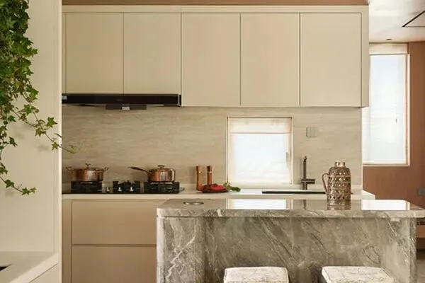 移步到了厨房空间。厨房的面积不大,但是,却给人一种舒适的体验感。在这个方寸空间里,设计师Kale做了匠艺的设计,颇费了设计的技巧。在这里,一个光洁亮丽的大理石岛台,与白色的精致橱柜,将智能厨电无缝嵌入其中,在视觉上进行了完美的统一。在高端的灶具,与精巧的五金的配合下,整间厨房里,散发出了便捷简洁的质感来。它虽小,但是一应俱全了。厨房,家的烟火之地,它是家里接触地气的地方。每当Anne在这里,为自己的一天开始停泊与烹饪,这城市生活里的曼妙滋味也被她寻觅着。无论你来自五湖四海,你也会囿于厨房与爱。这间玲珑剔透的厨房里,散发着舒展的家的韵律,也转译了家的舒适度。