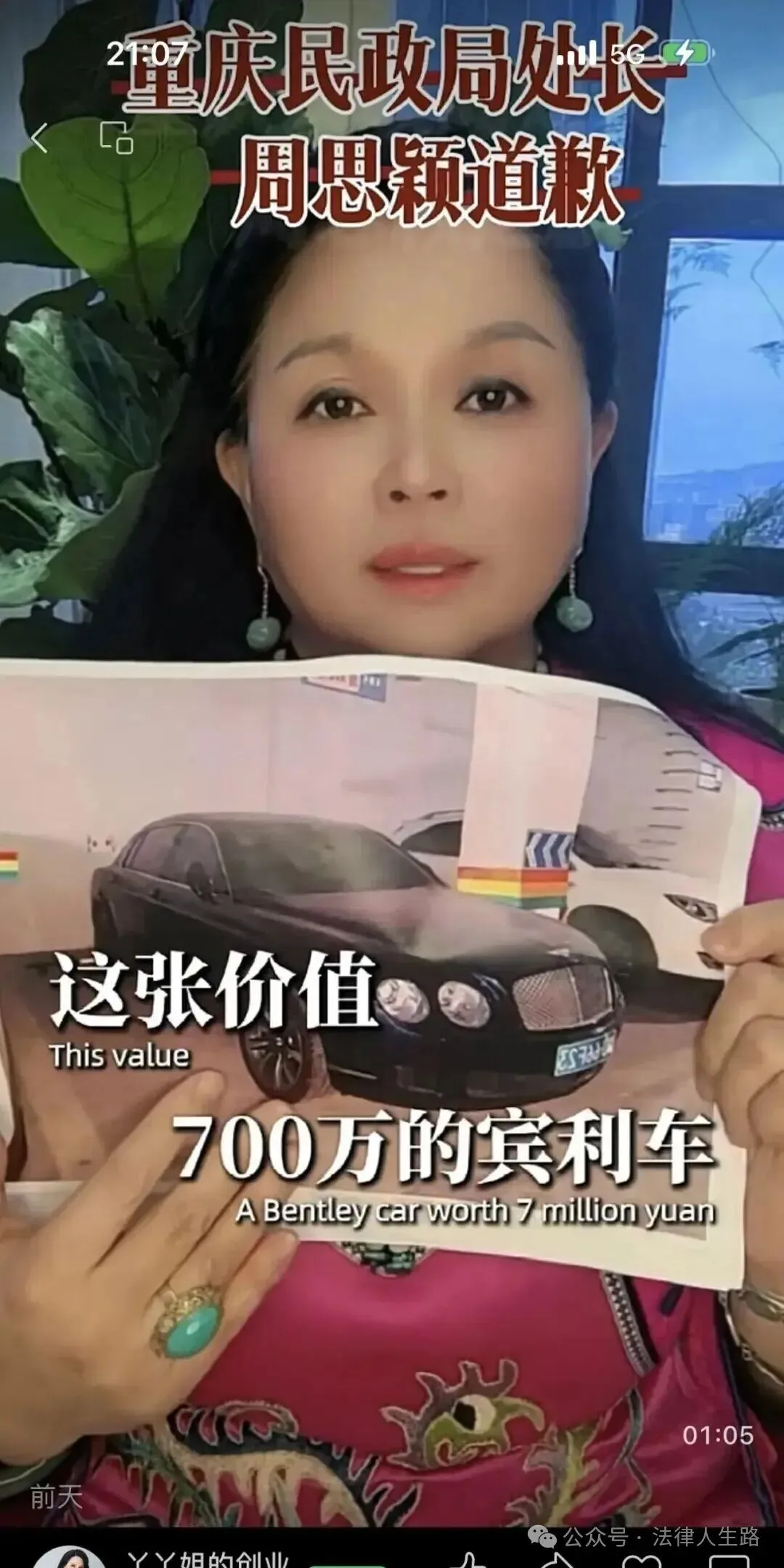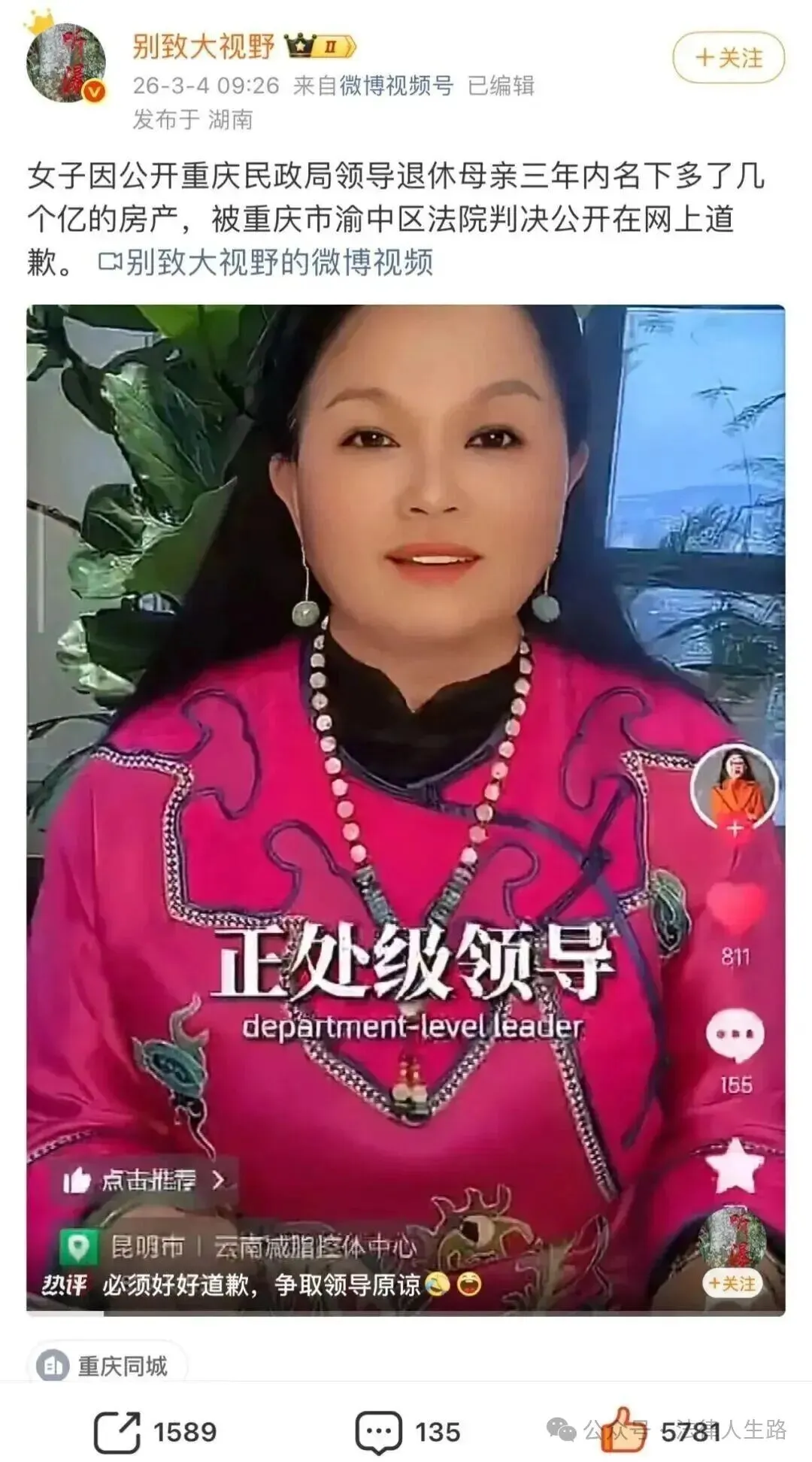 该女子在道歉视频上说:“周某颖处长,对不起,我不应该公开你母亲名下价值700万的宾利车和三年之内名下多了几个亿的房产,你母亲生于1952年,是重庆气体制造厂配电石的金属冶炼工人,今年74岁,已退休多年,我真的是认知不够,我不知道你母亲有那么大的能耐,74岁的一个退休老人,既然能在三年内挣到这几个亿的房产,作为一个25年做生意的我来说,在当今这么困难的经济条件下,没有几个人能有那么大的能力,所以你的母亲让我很佩服,我也冤枉你了,我也错怪你了,对不起,我们应该多向你母亲学习,学习她的经商之道,学习她的挣钱能力。”