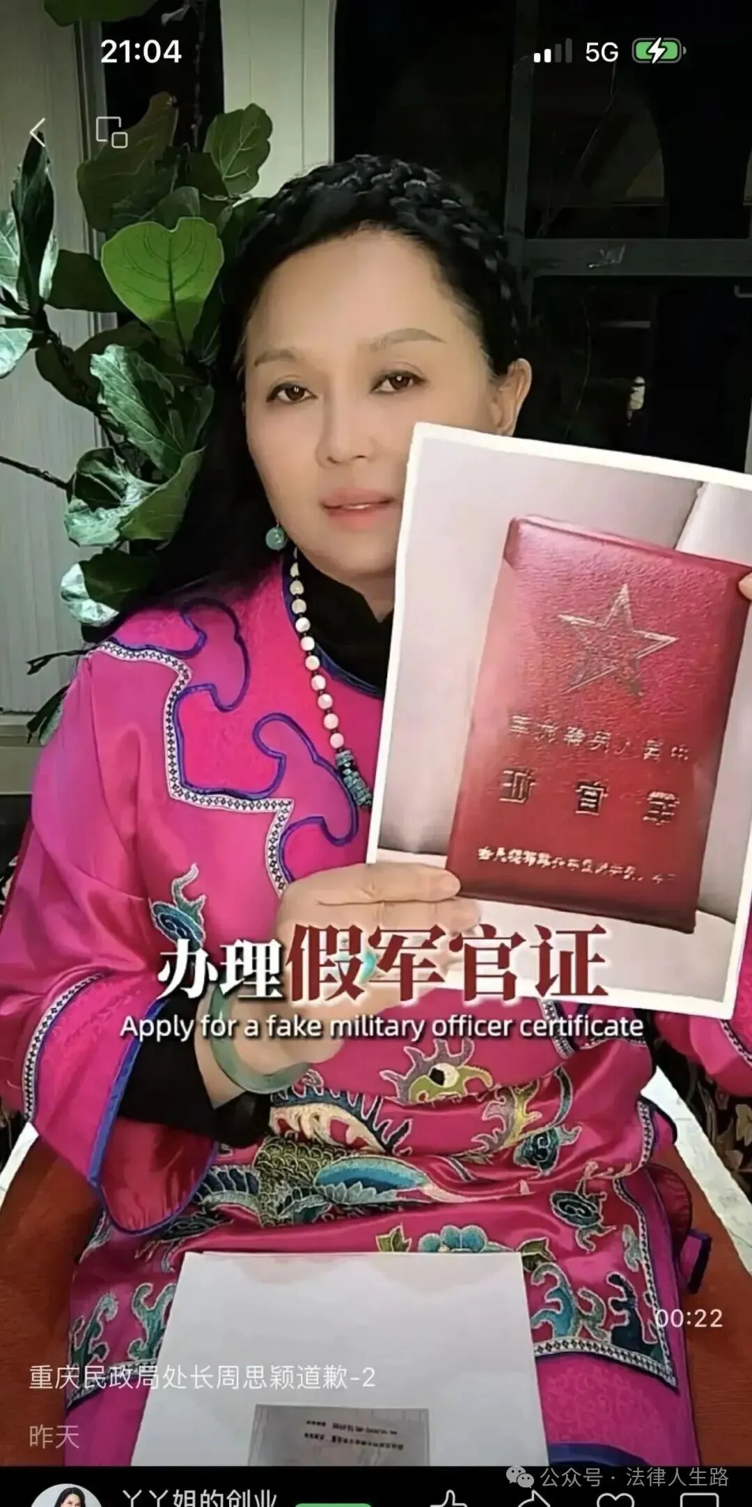 另外,在第二条道歉视频中,她特列举了周某颖处长的一系列身份头衔,然后画风一转,说道:“你真的非常优秀,我在此向你道歉,我不应该将你没有当过兵的老公办理假军官证、假身份证这些事情发到网上,对不起,我错了,我向你赔礼道歉,这是属于你职权范围内的事,这是属于你家庭里面的隐私,所以,我不能公开发到网上。”