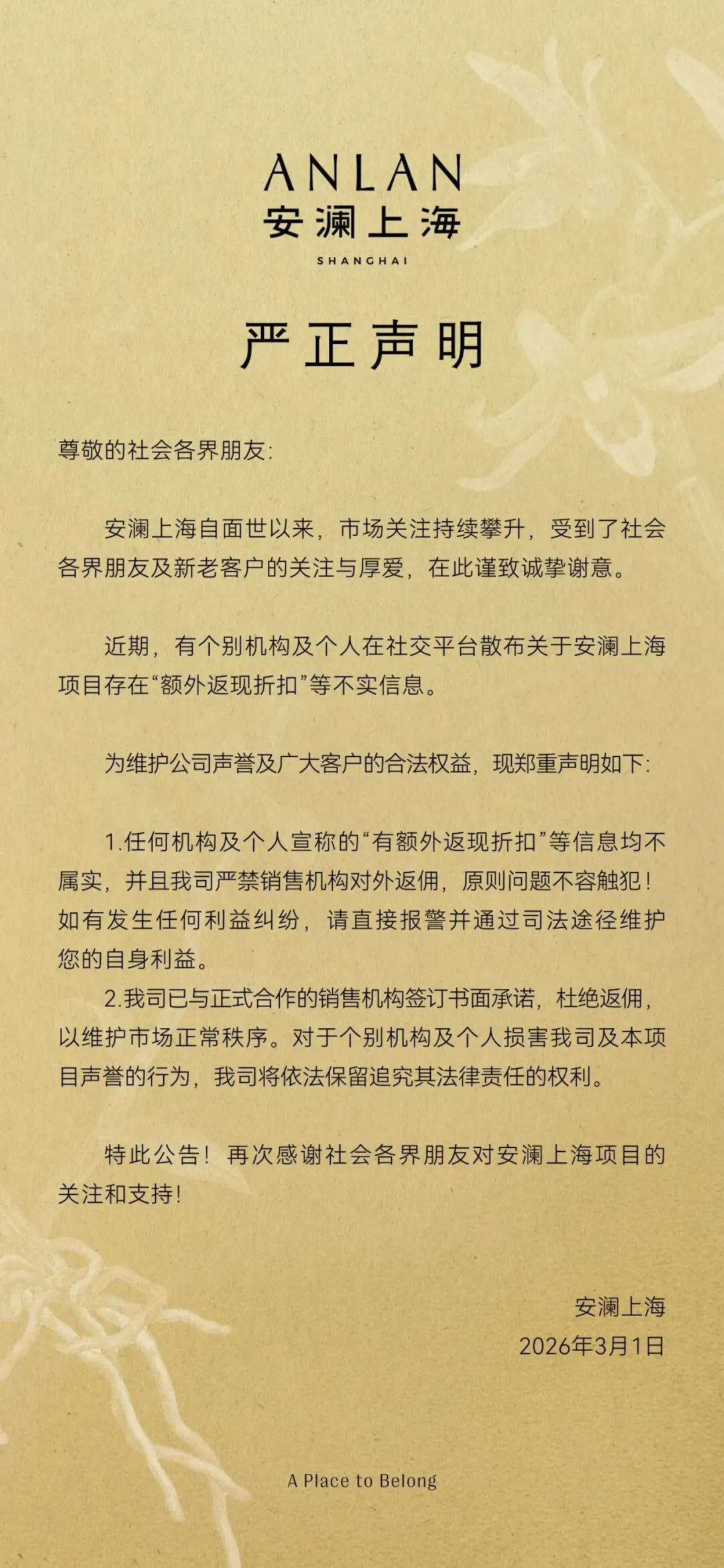 3月1日,安澜上海就此发布严正声明,指出任何机构及个人宣称的“有额外返现折扣"等信息均不属实,并且我司严禁销售机构对外返佣,原则问题不容触犯。如有发生任何利益纠纷,请直接报警并通过司法途径维护您的自身利益。