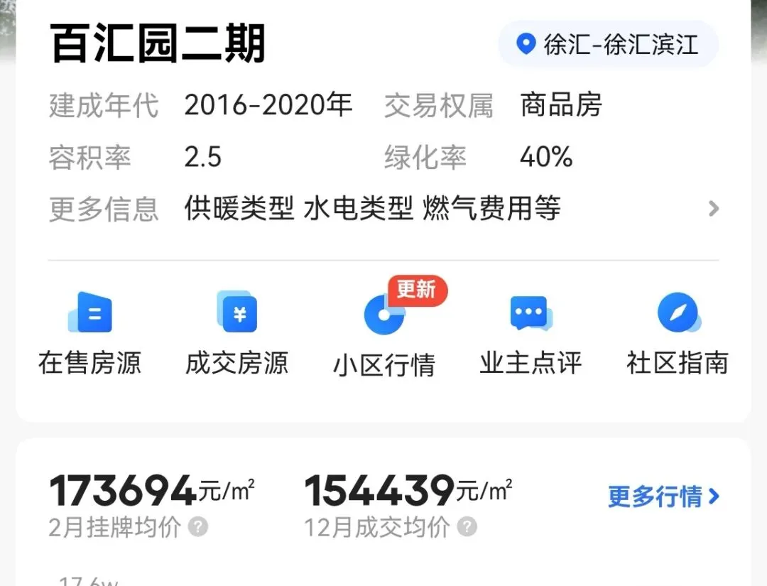 直线距离2.3公里外的百汇园二期目前挂牌均价17.3万每平,去年12月实际成交均价15.4万每平。