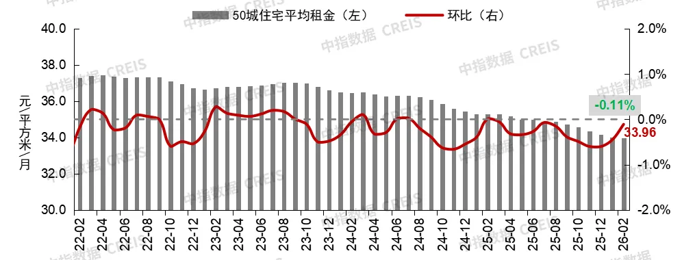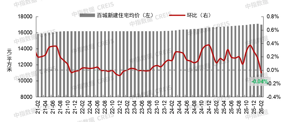 根据中国房地产指数系统百城价格指数对全国100个城市新建、二手住宅销售市场及50个城市租赁市场的调查数据:2026年2月,受春节假期影响,市场挂牌及交易活跃度季节性回落,百城二手住宅均价为12835元/平方米,环比下跌0.54%,跌幅较上月收窄0.31个百分点,同比下跌8.78%。新房方面,假期期间,多地政府与房企普遍推出购房节、降价促销等活动,但新推项目整体较少,以存量项目去化为主,2月百城新建住宅均价为17107元/平方米,环比微跌0.04%,同比上涨2.37%。租赁住宅方面,2月部分城市因春节假期旅游热度较高,短租需求增加,50城住宅平均租金为33.96元/平方米/月,环比下跌0.11%,较1月收窄0.34个百分点,同比下跌3.79%。