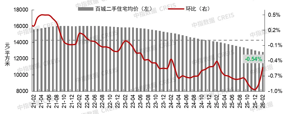 2026 年2月百城二手住宅价格及环比涨跌幅