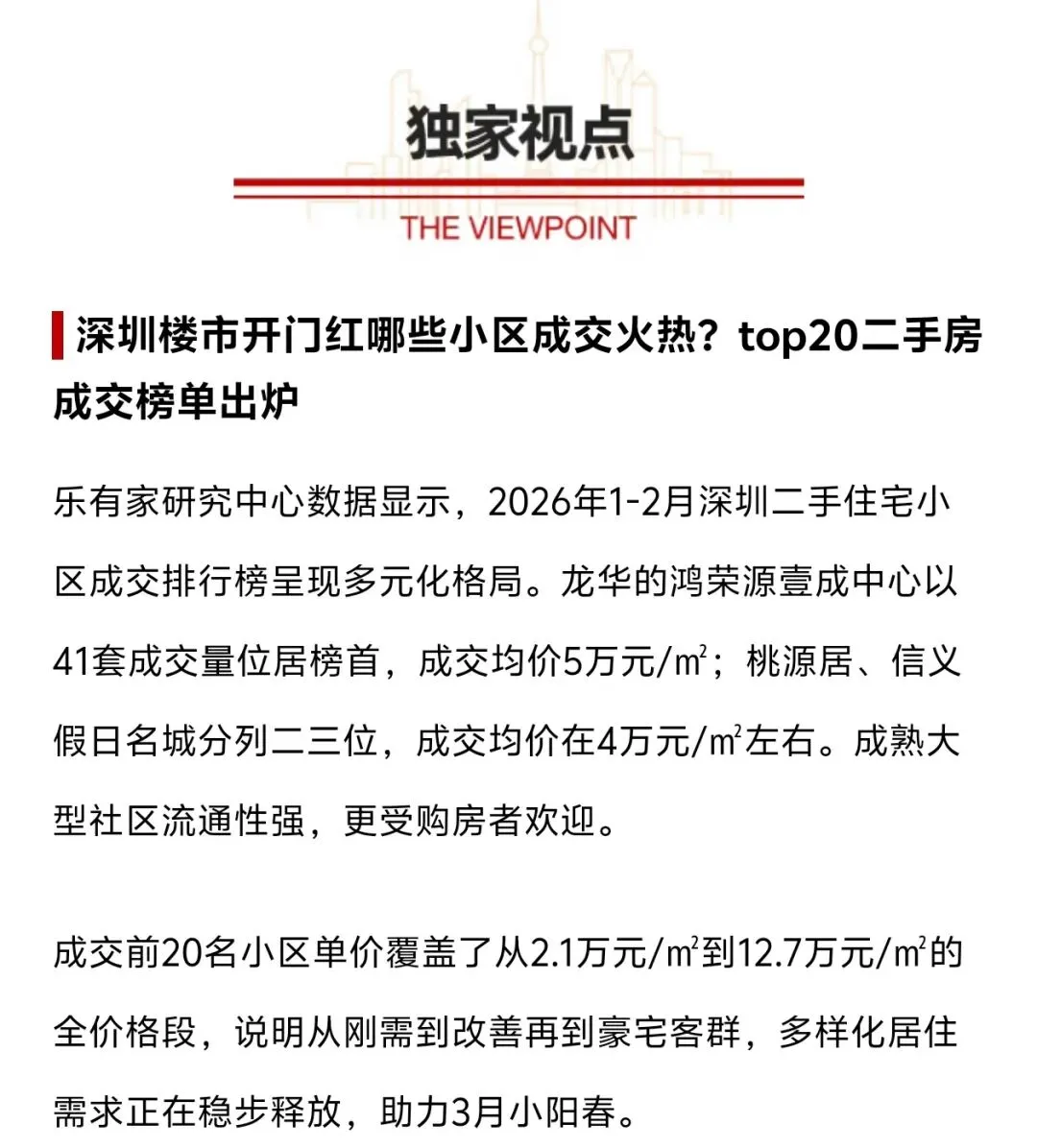 2026年深圳楼市开年迎暖,3月首周一二手住宅网签数据飘红,1-2月二手房成交榜单多元格局凸显,叠加全国两会释放的重磅楼市政策,深圳楼市“小阳春”行情持续升温。刚需、改善、豪宅需求全面释放,成熟社区成置业热门,政策端的精准发力更让市场迎来多重利好,深圳房地产市场正朝着平稳健康的方向稳步前行。乐有家研究中心最新数据显示,截至3月5日,深圳3月一手住宅预售网签累计194套,现售网签累计318套,预售+现售网签合计512套;二手住宅当月网签累计659套,开年首周成交数据稳步走高,为三月楼市奠定良好开局。这一数据并非偶然,春节后深圳楼市的活跃度早已超出市场预期。春节假期期间,深圳二手房日均成交3.1套,同比大幅上升211.1%,新房日均成交3.7套,同比上涨125.6%,打破了往年春节楼市淡季的惯性。节后开工首周,二手住宅签约量较节前上涨94%,一手住宅签约量更是大涨220%,看房量、成交量同步攀升,市场回暖信号愈发明显。🏘️ 二手房成交TOP20出炉!成熟社区成流通主力2026年1-2月深圳二手住宅小区成交TOP20榜单新鲜发布,龙华鸿荣源壹成中心以41套的成交量登顶榜首,成交均价5.0万元/㎡,宝安桃源居、龙岗信义假日名城分别以39套、30套位列二、三位,成交均价均在4.0万元/㎡左右,成熟大型社区的流通优势尽显无遗。本次上榜的20个小区覆盖深圳龙华、宝安、龙岗、罗湖、福田、南山六大城区,成交单价跨度从2.1万元/㎡到12.7万元/㎡,龙岗丽湖花园以2.1万元/㎡成为榜单刚需洼地,南山华润城润府则以12.7万元/㎡成为豪宅代表,充分展现了深圳楼市从刚需到改善再到豪宅的全维度需求释放。从成交特征来看,成交量靠前的小区均为配套成熟、居住氛围浓厚的大型社区,这类社区不仅交通、商业、教育配套完善,且房源流通性强、性价比突出,成为刚需和首改客群的首选。而南山、福田核心城区的高端小区则凭借地段和品质优势,吸引豪宅客群入手,市场分化下的结构性机会愈发清晰。3月5日,全国两会传来重磅楼市信号,政府工作报告将稳定房地产市场作为重点领域风险防范化解的核心内容,明确提出控增量、去库存、优供给的核心方向,同时围绕住房保障、公积金改革等推出一系列举措,为房地产行业高质量发展定调。两会明确提出探索多渠道盘活存量商品房,鼓励收购存量商品房重点用于保障性住房,这一举措既有效化解了商品房库存,又完善了住房保障体系,实现“去库存”与“保民生”的双重目标。同时,各地将继续因城施策,精准调控房地产增量供给,推动市场供需结构更趋合理。政府工作报告特别提出,加强初婚初育家庭住房保障,支持多子女家庭改善性住房需求,并完善生育保险制度和生育休假制度。这一政策精准贴合当下民生需求,通过住房保障支持婚育观念引导,同时释放改善型住房需求,为楼市注入持续动力。时隔11年,住房公积金改革再次写入政府工作报告,且报告中罕见两次提及公积金相关举措,包括下调个人住房公积金贷款利率、深化制度改革。机构测算显示,本次公积金改革预计可释放约5151亿元资金,按70%的消费倾向计算,理论上可拉动3606亿元消费,提升居民消费增速0.7个百分点。2026年初各地公积金新政已密集落地,精准匹配刚需与改善型住房需求,降低居民购房压力,从金融层面为置业者减负,进一步激活合理住房需求。当前深圳楼市正迎来多重利好叠加期,一方面,二手房市场连续三个月价格企稳回升,2月二手住宅成交均价环比上涨7.3%,刚需、改善需求持续释放,成熟社区和核心城区优质房源成交热度居高不下;另一方面,全国两会的政策定调为市场注入信心,公积金改革、住房保障升级等举措将进一步降低置业门槛,释放市场潜力。机构分析认为,随着3月入学报名季开启,学区房需求将进一步释放,叠加开发商推出的各类促销政策和深港融合带来的置业需求,深圳楼市“小阳春”行情将持续升温。而从长期来看,房地产行业正从高速发展转向高质量发展,“好房子”建设、物业服务提升成为行业新方向,存量房与增量房双轮驱动的市场格局将逐步形成。对于置业者而言,当下深圳楼市供需稳定、政策友好,刚需客群可重点关注配套成熟的高流通性社区,改善客群可把握政策利好适时置换,市场分化下,择房的核心仍将是地段、配套、品质三大关键因素。2026年的深圳楼市,在政策精准调控和市场内生需求的双重推动下,正朝着更平稳、更健康、更多元的方向发展,楼市的“春天”已悄然到来!每日更新笋盘和深圳房产相关,您的点赞与关注,化作我坚持创作的动力*^_^*💝💝💝