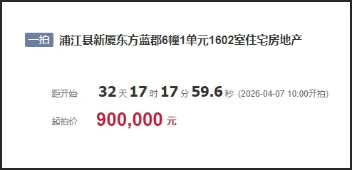 浦江县新厦东方蓝郡6幢1单元1602室住宅房地产一拍起拍价90万元,建筑面积87平米,折合10344元/平米。会以什么价格成交?在市场行情温度总体不高的情况下,能否被追捧,值得关注。▬▬▬