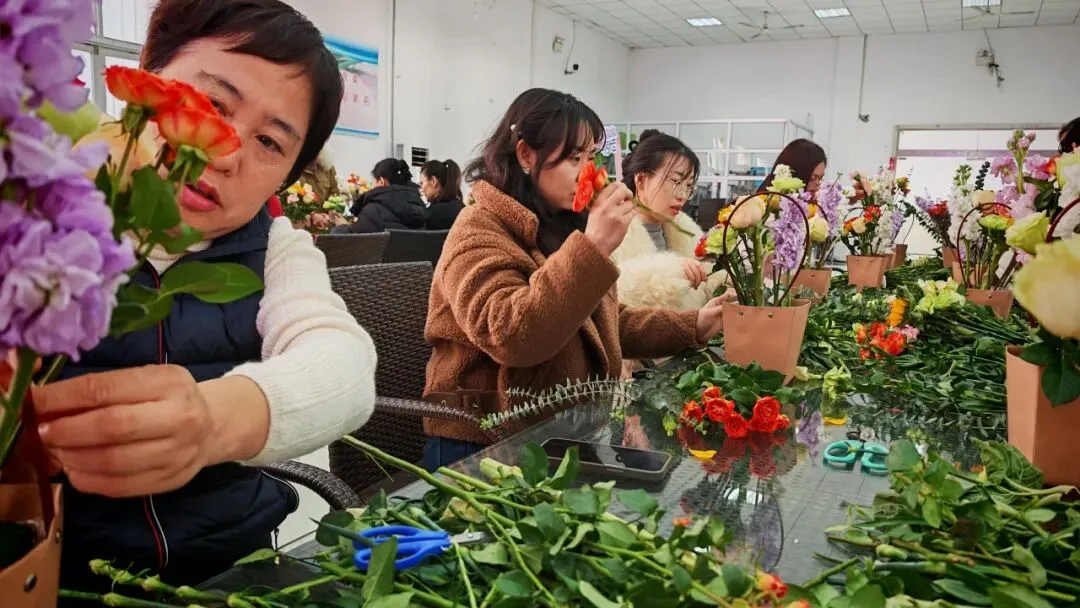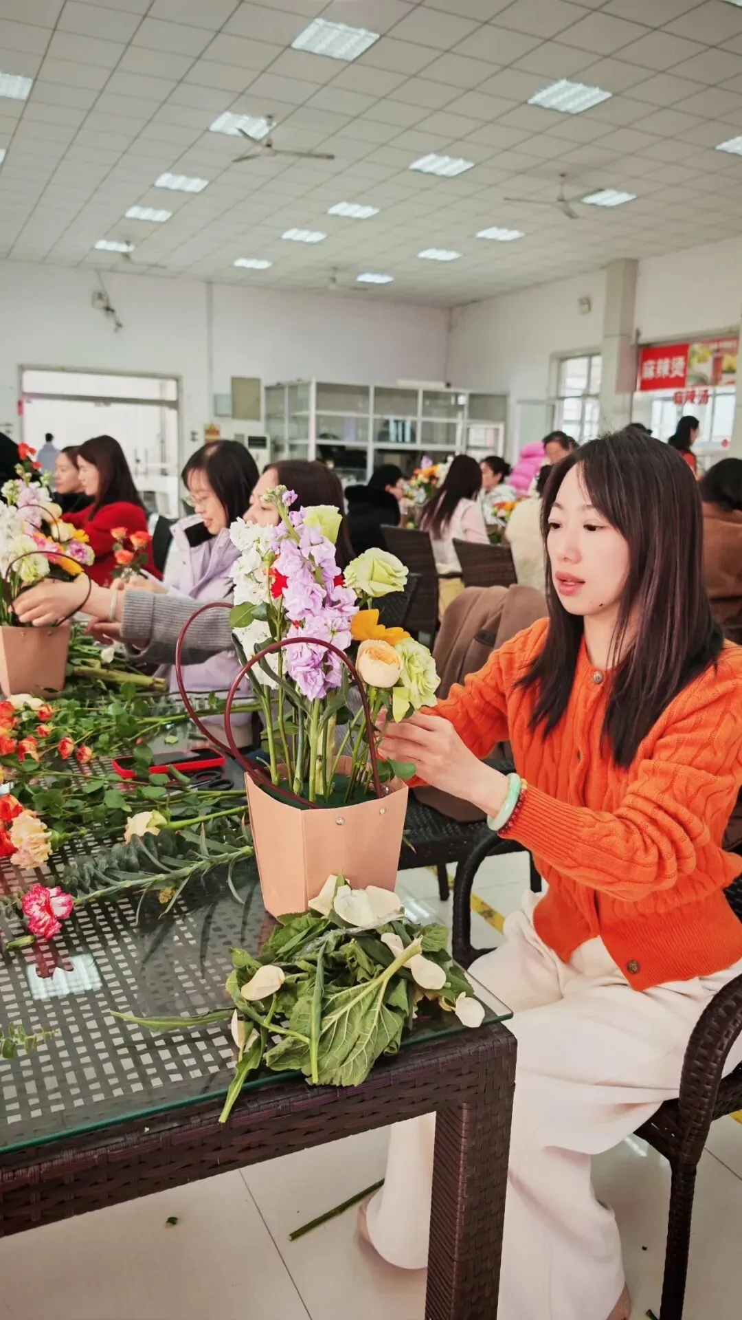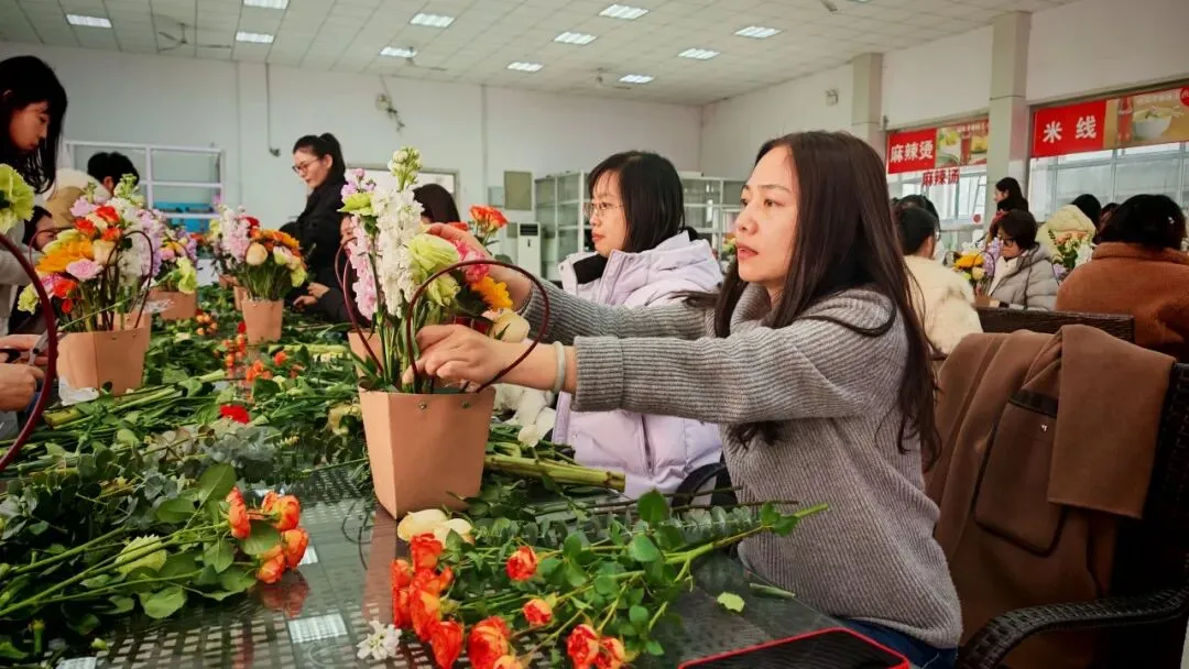 笑语盈盈间,大家捧着自己亲手创作的花艺作品,三五成群在节日专属展板前拍照打卡,在花香与光影中定格属于自己的节日仪式感。