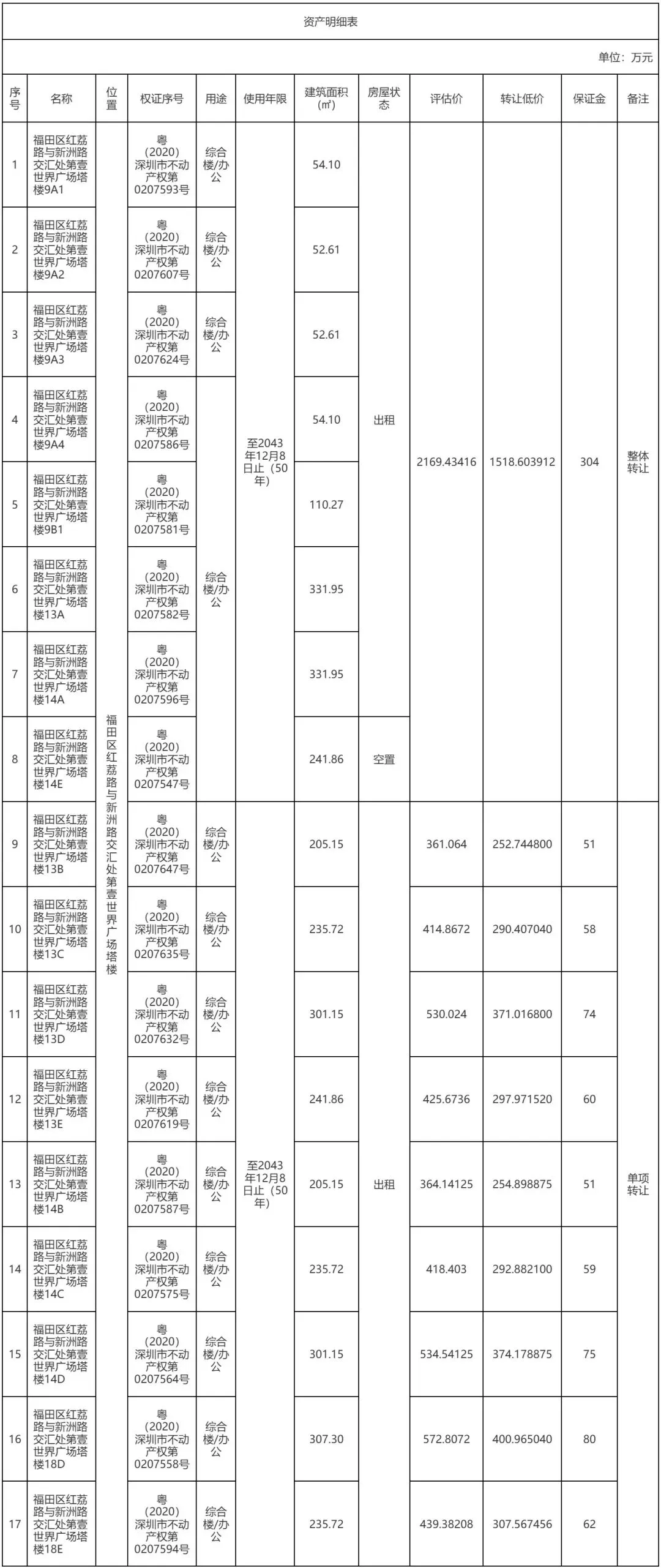 深圳市福田区景田红荔西路7002号第壹世界广场A座写字楼9B1等17项房产意向征集