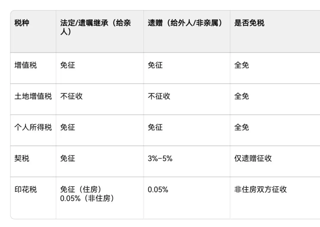 - 亲人之间继承,几乎无税(仅非住房涉及少量印花税);