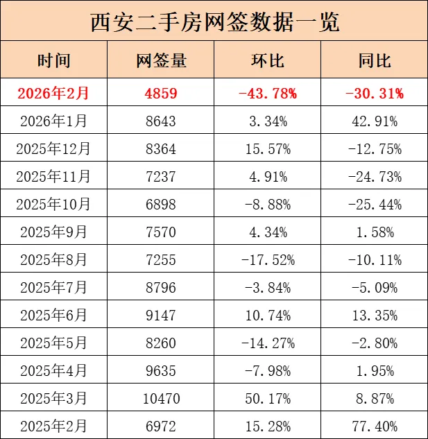 2026年3月6日,西安市住建局发布了最新的2月份二手房网签数据。看到这个数字,我猜你心里的第一反应可能跟我一样:“才4859套?比上个月跌了不少啊。”确实,数据摆在这里:和2026年1月那热热闹闹的8643套相比,减少了近3800套,环比下降了43.78%。这个数据让人不禁想问:难道“小阳春”还没开始就结束了?市场又要冷下去了?但我想告诉你的是:千万别被这个“跌”字吓到了。如果结合当下的特殊情况来看,这近5000套的成交量,其实是一份相当“硬核”的成绩单。