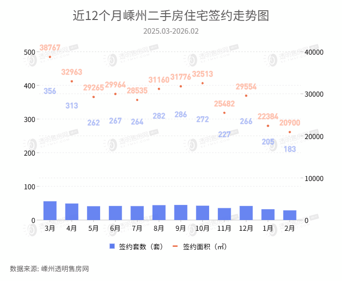 2026年2月二手房签约183套,签约面积20900㎡,签约量环比下降10.73%,同比下降33.70%。