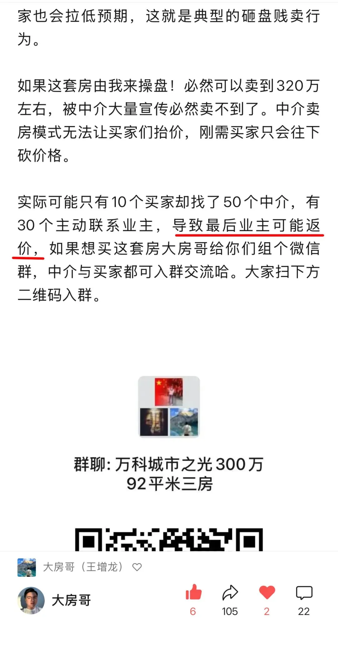 昨天,万科城市之光A4栋那套房如我所料业主返价了,太多中介打电话给他把弄高潮了,现在要卖330万,却没有人买。证明了中介们都太舔买家,中介都在抢买家,一边轰炸卖家,一边引导买家加价,导致卖家意淫。如果你有意向买城市之光的房子,我这里有大量独家工抵房,性价比急高比二手房业主靠谱。下图是我操盘的工抵房看房现场,无中介合作,来的还全部都会全款买家。即使贝壳聚焦一套房也都做不到,这就是营销与销售的区别。